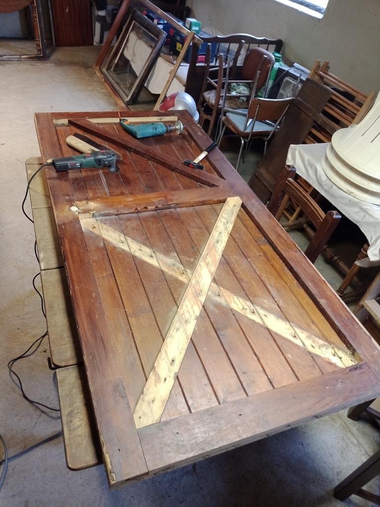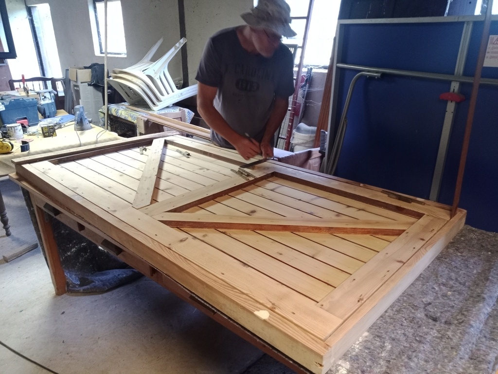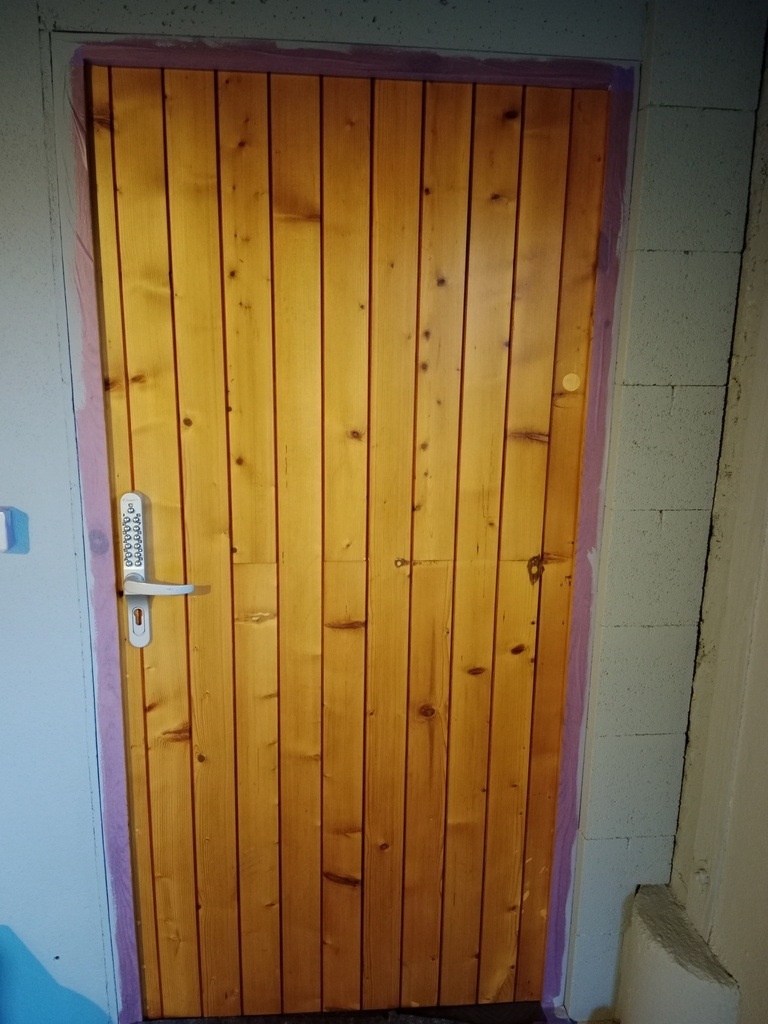 Blagues à part, les modifications étaient multiples : il fallait ramener le bois à sa teinte claire (il était lasuré foncé) pour le lasurer en clair. Il fallait diminuer la hauteur de la porte d'une douzaine de centimètres, ce qui était bien plus que la largeur de la traverse. Le sens d'ouverture changeait également, et une deuxième serrure présente sur la porte devait être enlevée, ce qui laissait apparent un gros trou. De plus, la porte était truffée de clous de partout et dans tous les sens !