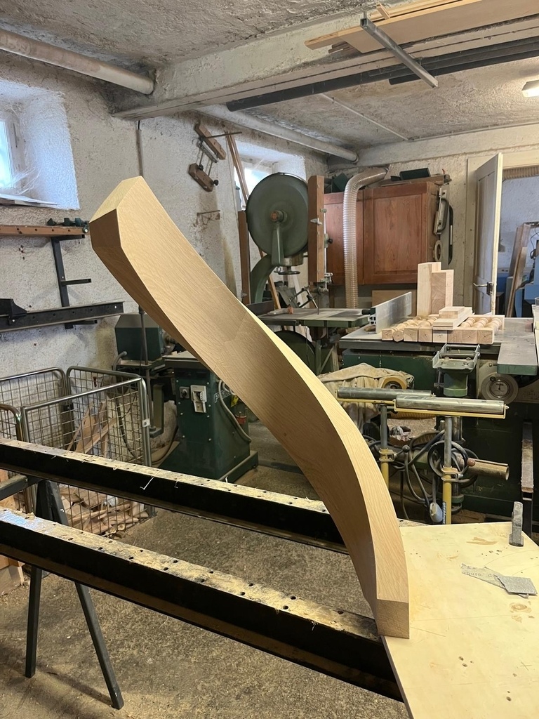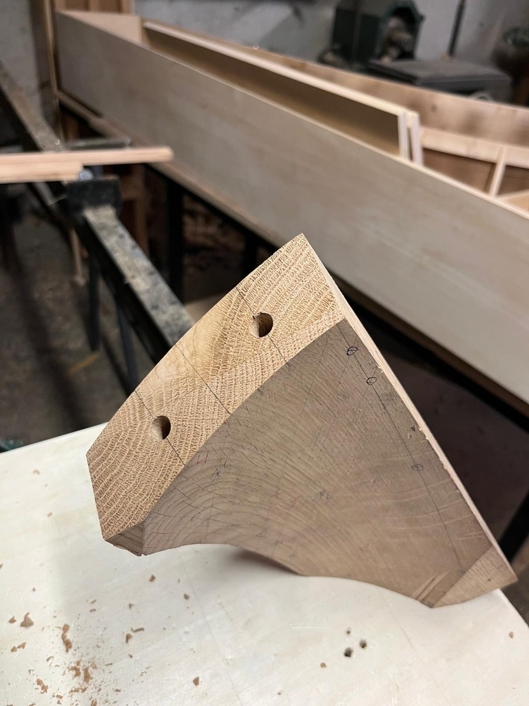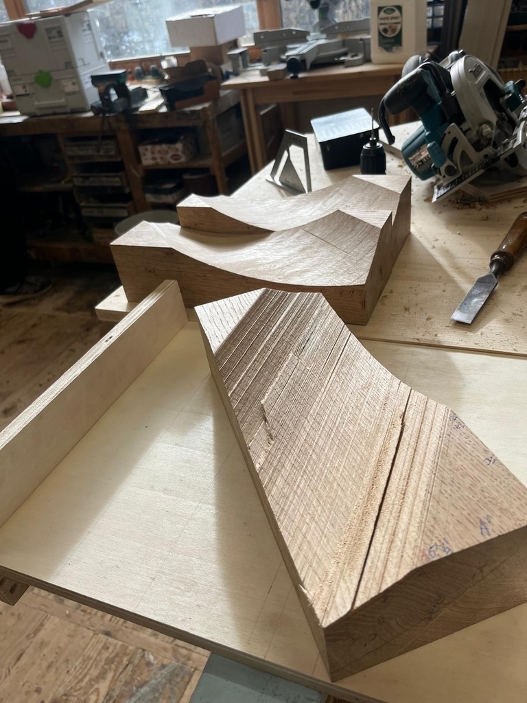 J'ai dégrossi les masses à la scie à ruban. J'ai passé la partie concave au bouffe-tout à la toupie et la partie convexe au rabot de paume à la main.