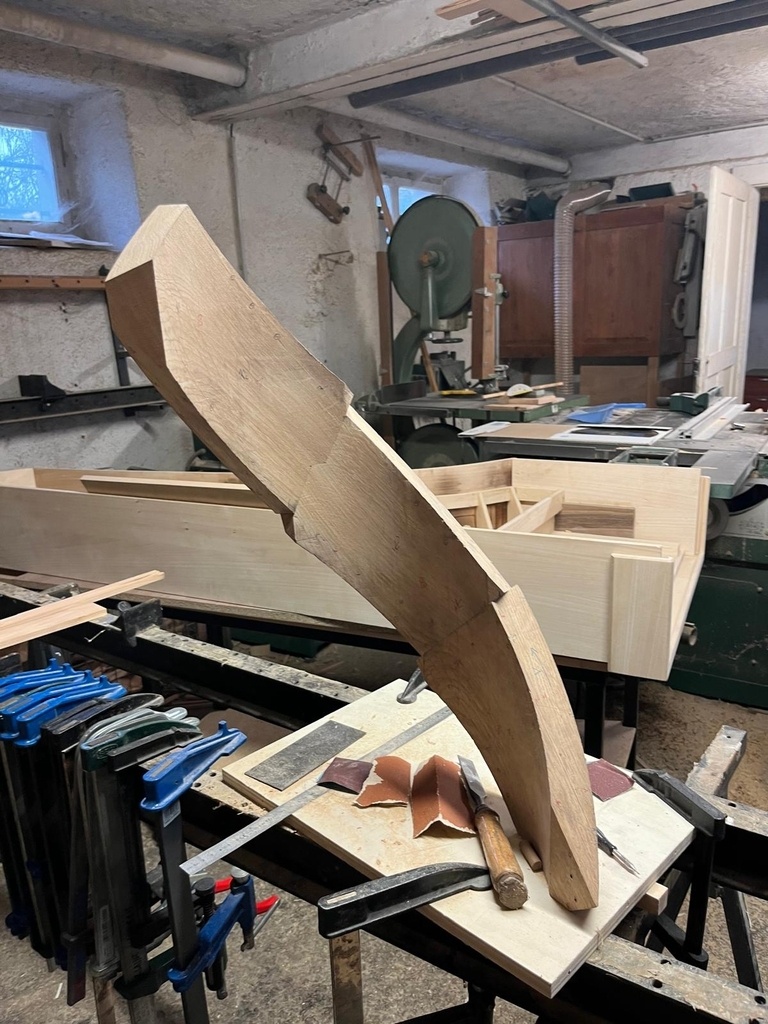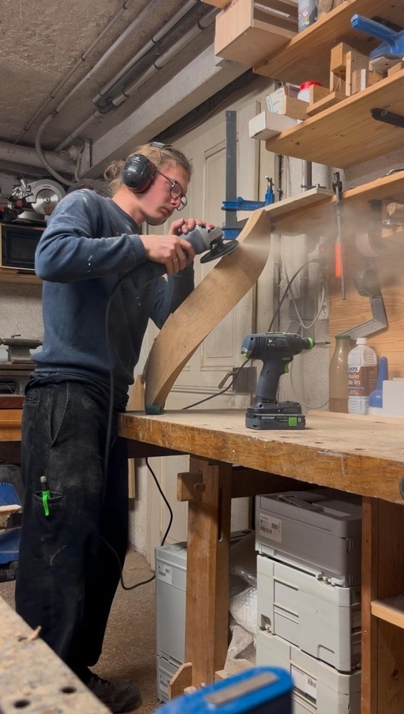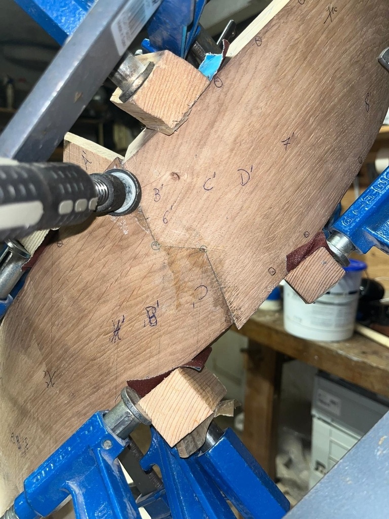 Les coupes, assemblées à tourillons, ont été collées avant le débillardement des pièces, que j'ai réalisé par la suite à la disqueuse avec un disque à poncer. Ensuite, pour avoir des chants propres, j'ai fini à la vastringue et au racloir.