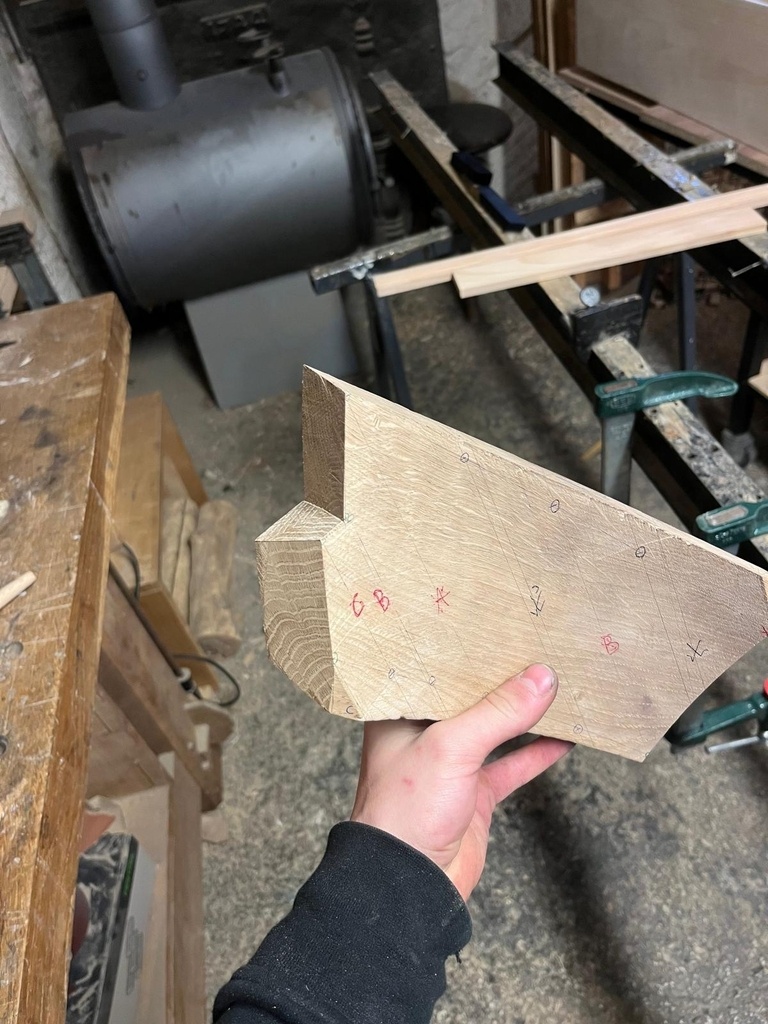 La coupe droite et les coupes d'aplomb ont été réalisées à la scie à format, et la coupe à crochet à la scie à main et au ciseau.