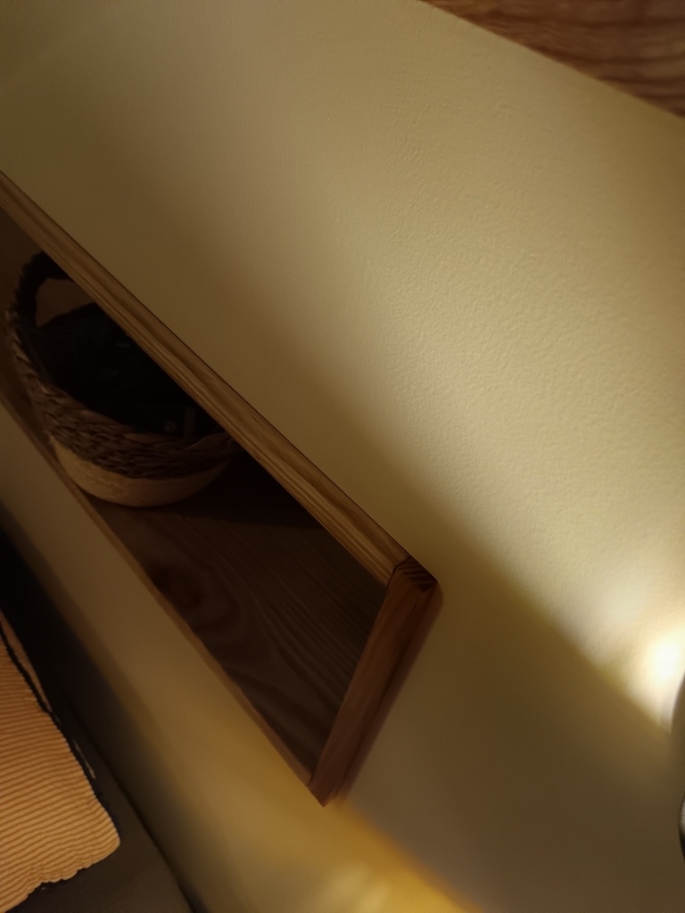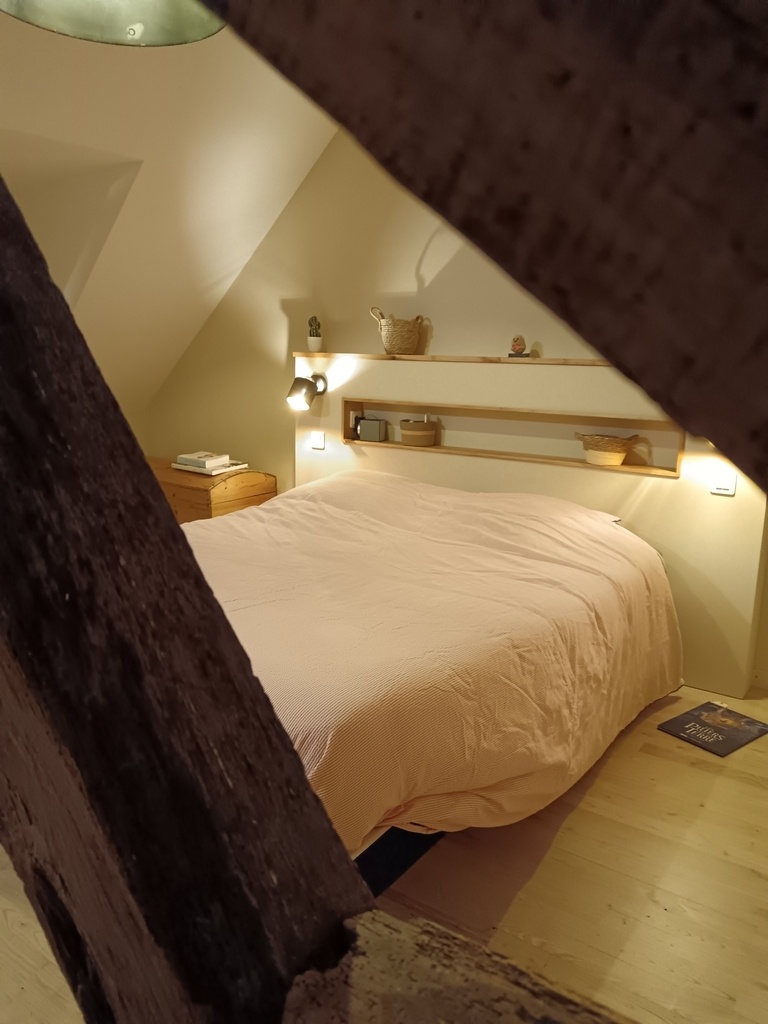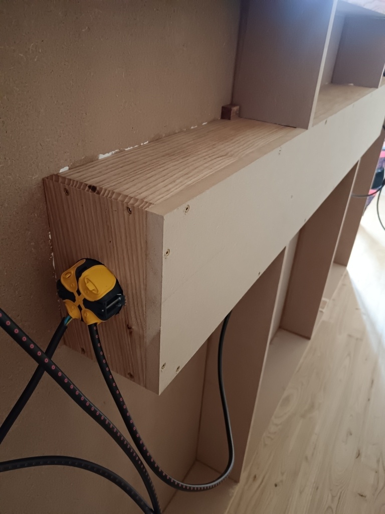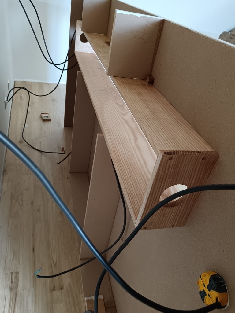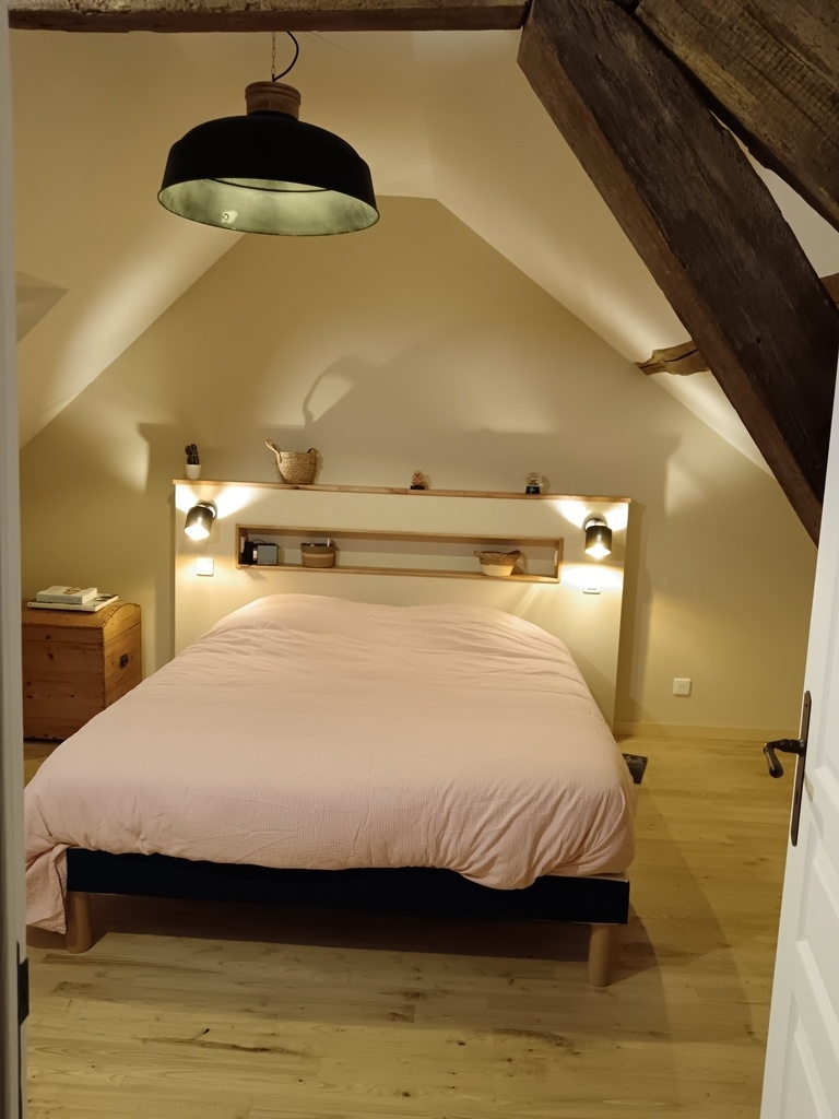Dans le cadre de la réfection total de la chambre (de la plaquisterie au parquet châtaignier), j'ai réalisé une tête de lit afin de créer du rangement et avoir un accès aisé au commande des simples allumage et va & vient.