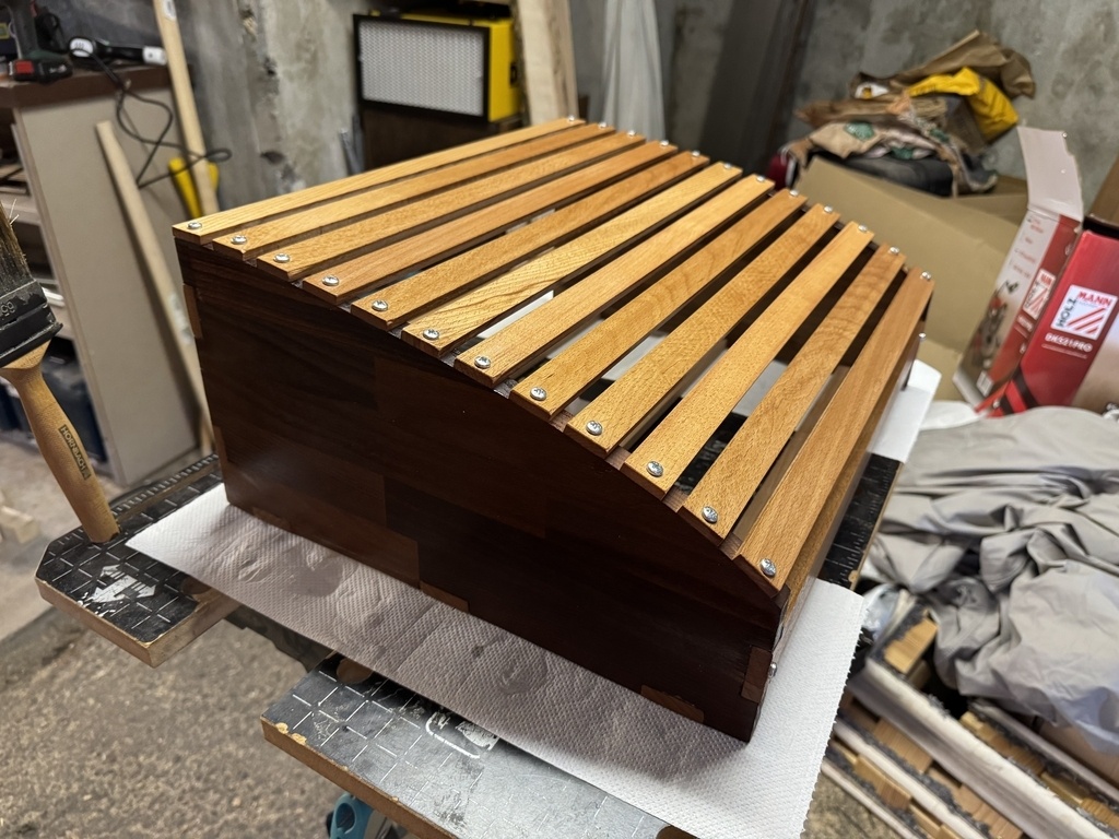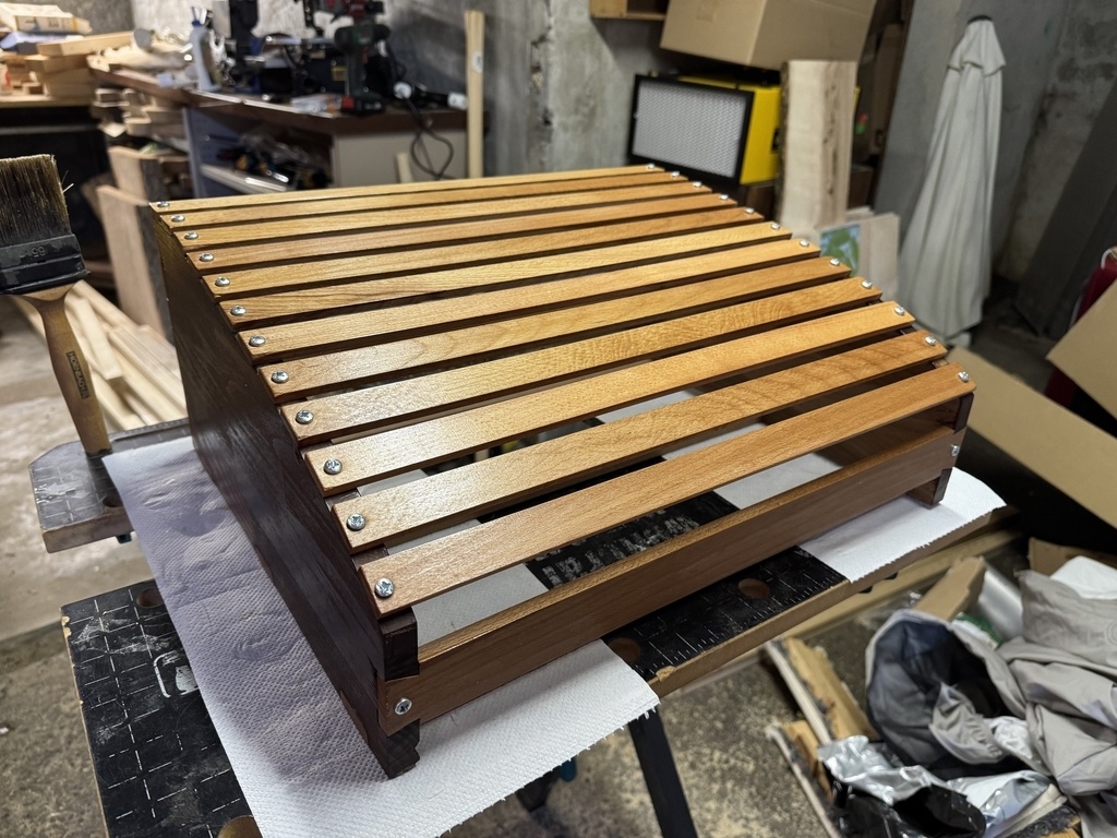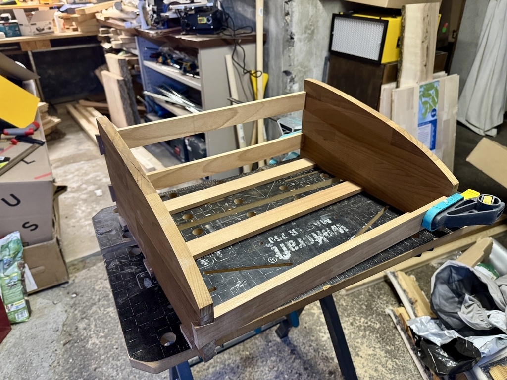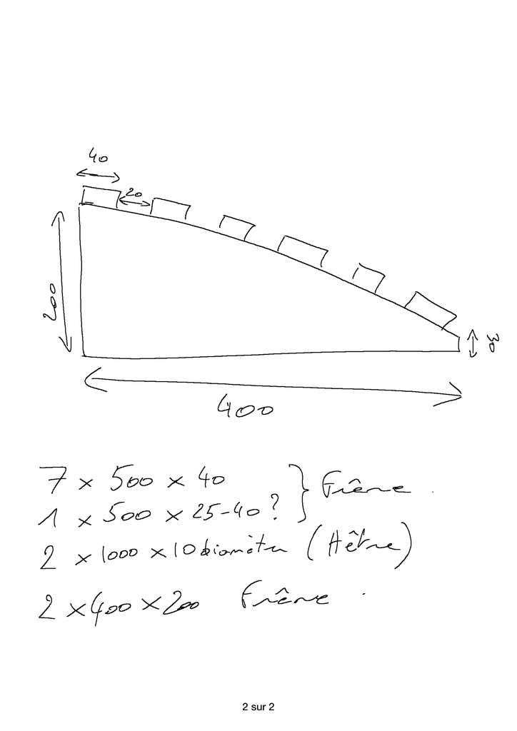 Après être tombé sur le repose-pieds de ginkgoSam, j’ai recyclé une planche de hêtre lamellée-collée et différents tasseaux en hêtre pour compléter la structure avec queue d’aronde de chaque coté. Les petites lattes sont simplement vissées (pas suffisamment confiance en moi pour faire des queues d’aronde sur une surface arrondie.