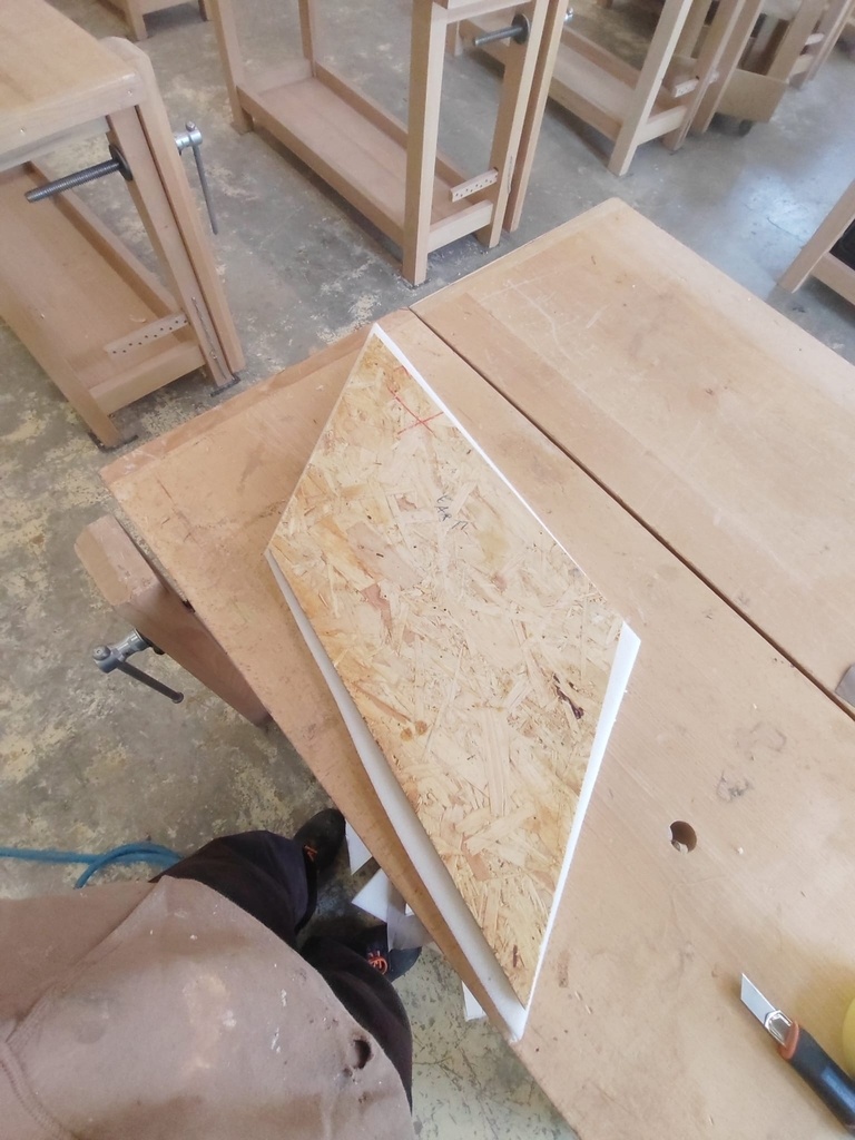 J'ai ensuite découpé les panneaux - des chutes - à la plongeante d'après l'épure. La clef étant de bien repérer le haut et la face avant pour ne pas se tromper pendant le gainage.