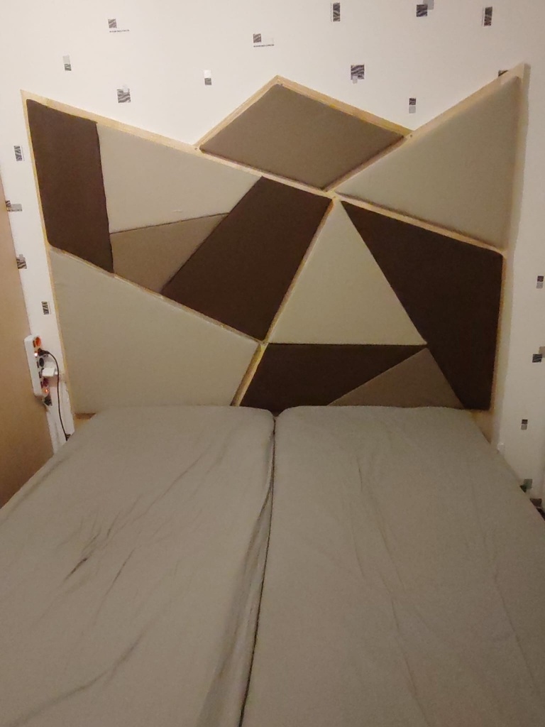 Plus qu'à découper le tissu avec un peu de marge (+-7cm) et à l'agrafer au dos. Le plus dur est de garder une tension constante lors de l'agrafage. J'ai fait en sorte de garder les arêtes d'équerre, sans trop écraser la mousse donc.