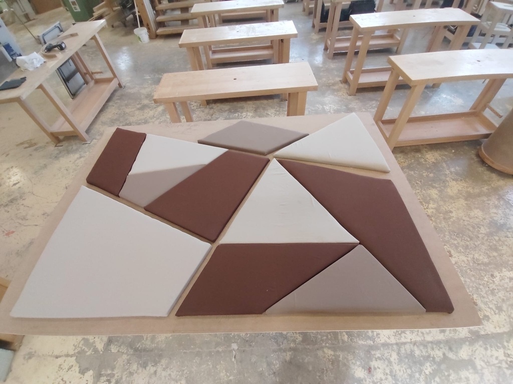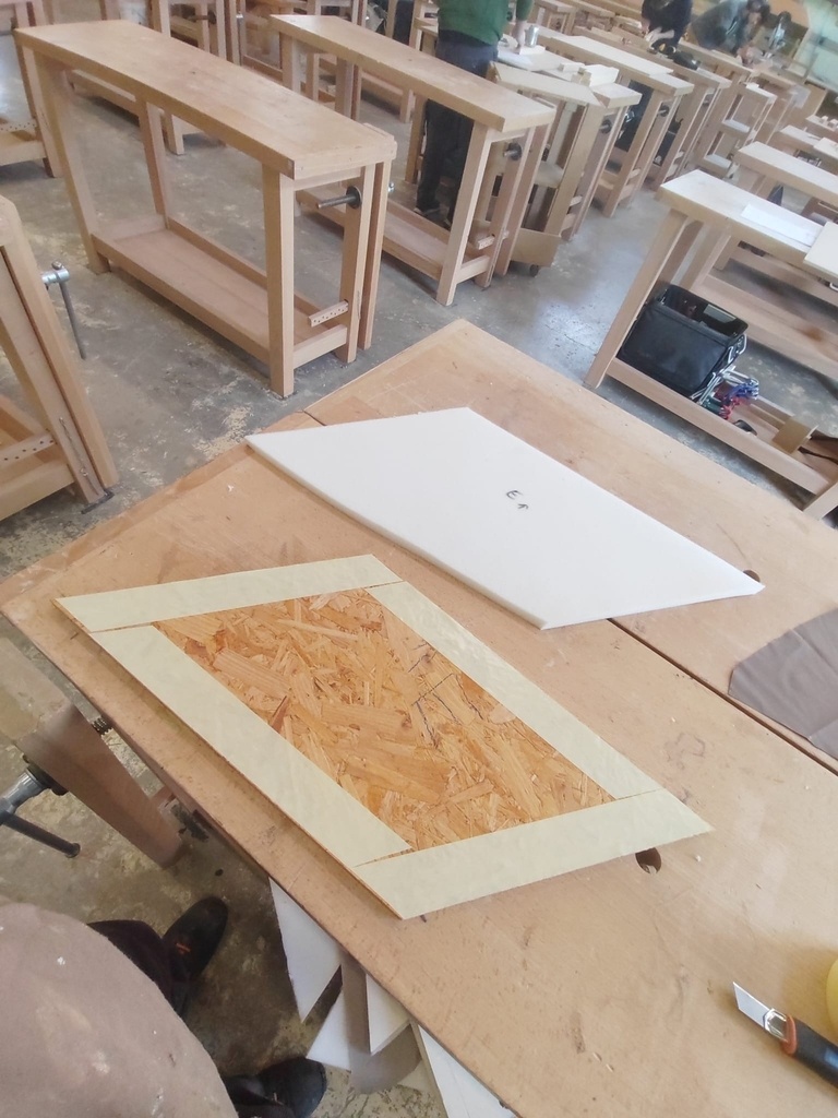 -Prédécouper la mousse, coller à la néoprène, tendre le tissu. Cette méthode fonctionne mais la mousse poreuse absorbe beaucoup trop de colle, ce n'est pas viable économiquement.