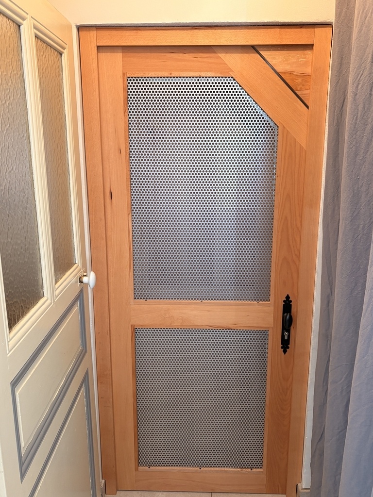 Quant à la fermeture celle-ci est gérée par un crochet fixé sur le cadre de la porte à la cime des panneaux.