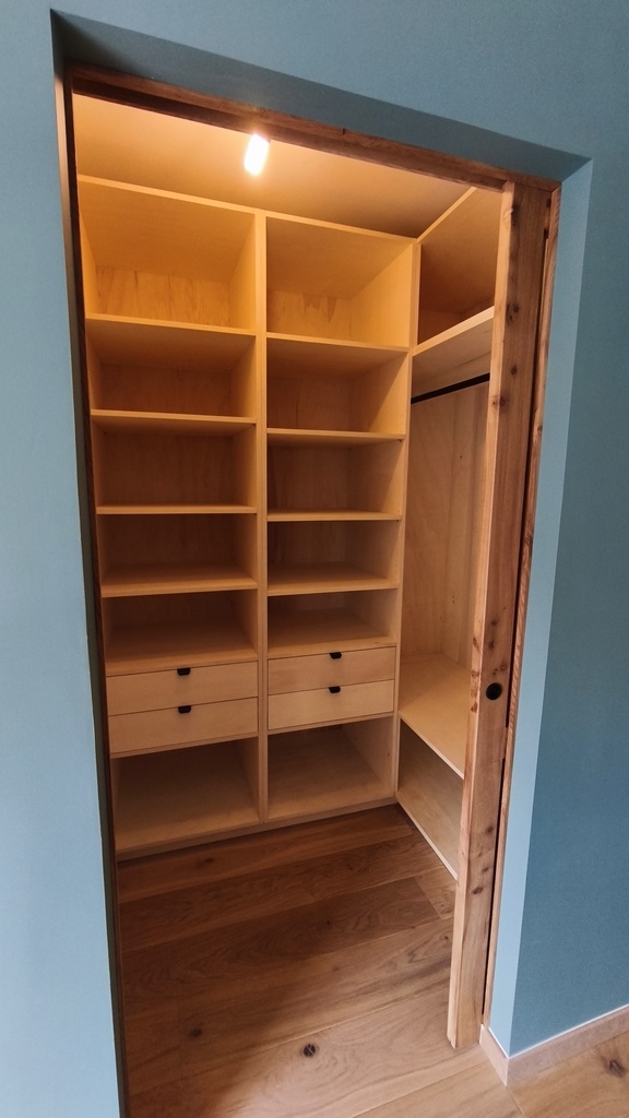Un p'tit dressing en cp peuplier dans un tout petit espace, un peut sport à tout rentrer là-dedans, mais c'est rentré !