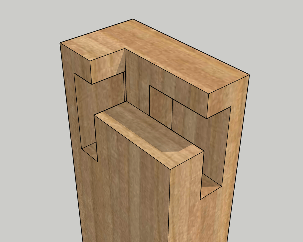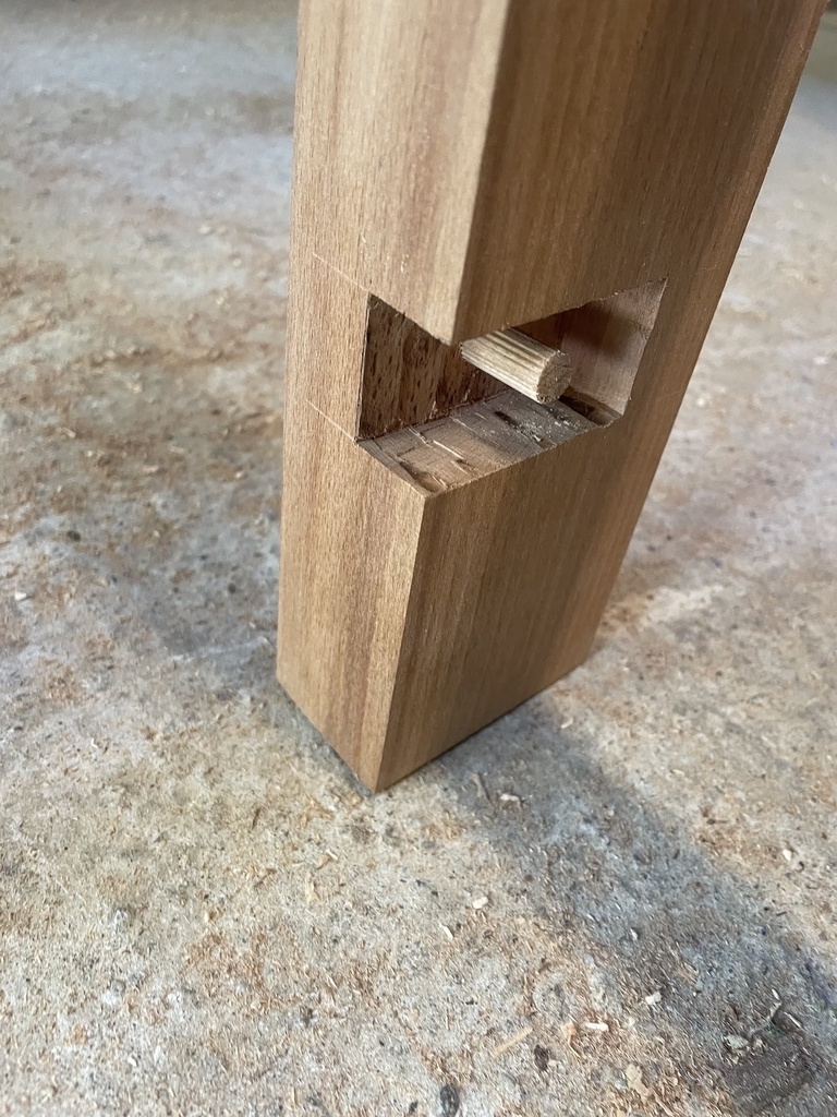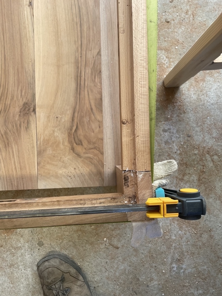 Le plateau du haut est encastré dans la ceinture et les pieds au moyen d'une feuillure réalisée sur tout le pourtour intérieur, ce qui donne un assemblage assez étrange au niveau des pieds puisque chacun d'entre eux doit à la fois accueillir deux mortaises et la feuillure.