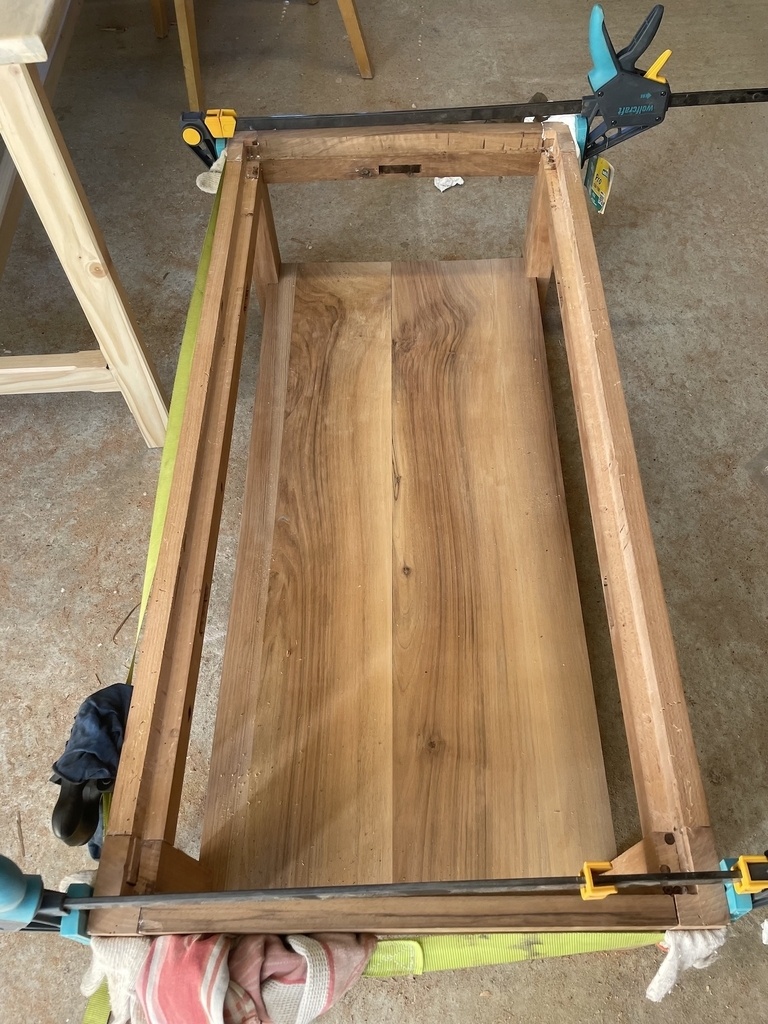 Les pieds et les deux traverses longitudinales sont aussi en merisier, mais les deux autres traverses (dans la largeur) sont en chêne.