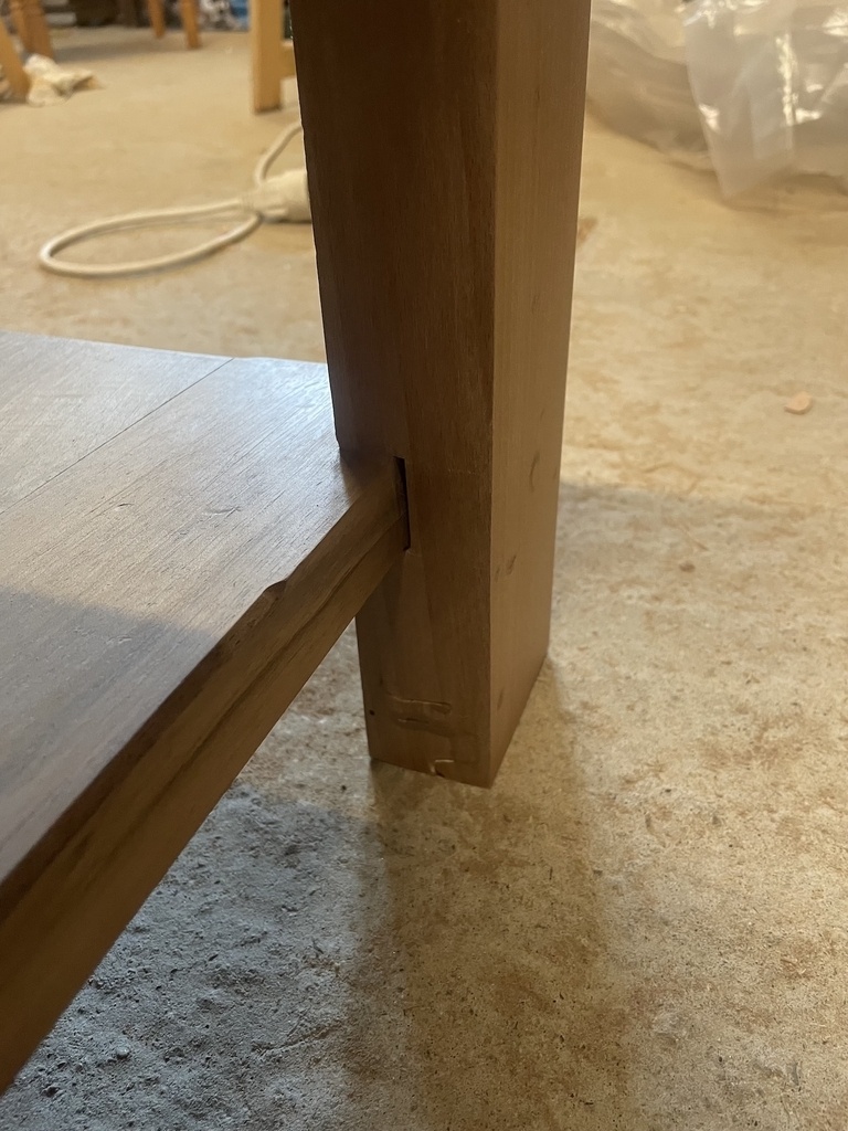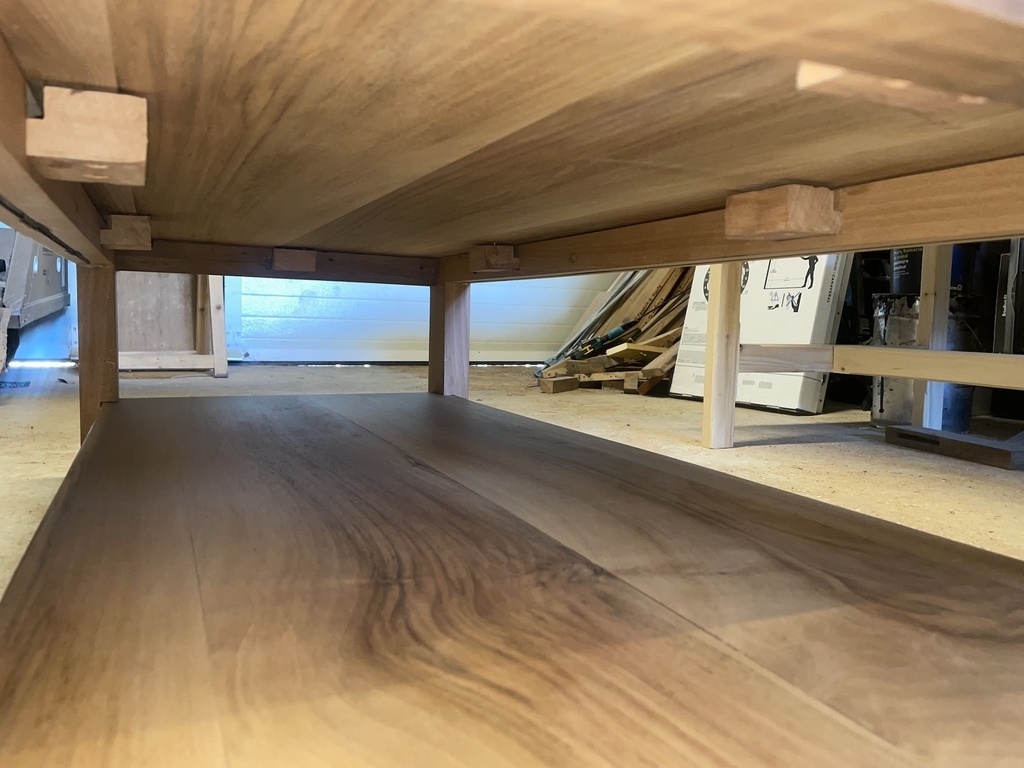 Le plateau inférieur est simplement maintenu dans des encoches taillées dans les pieds qui présentent chacune un tourillon inséré dans un chant du plateau, ce qui devrait lui permettre de "coulisser" avec une certaine résistance en se dilatant dans le sens de la largeur, mais pas en longueur. Si j'ai bien compris la théorie, le retrait du bois est minime dans le sens longitudinal.