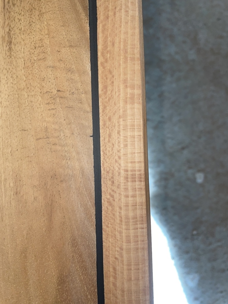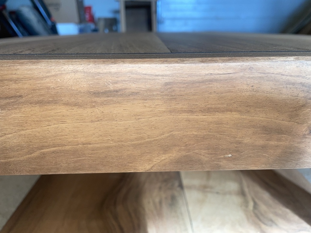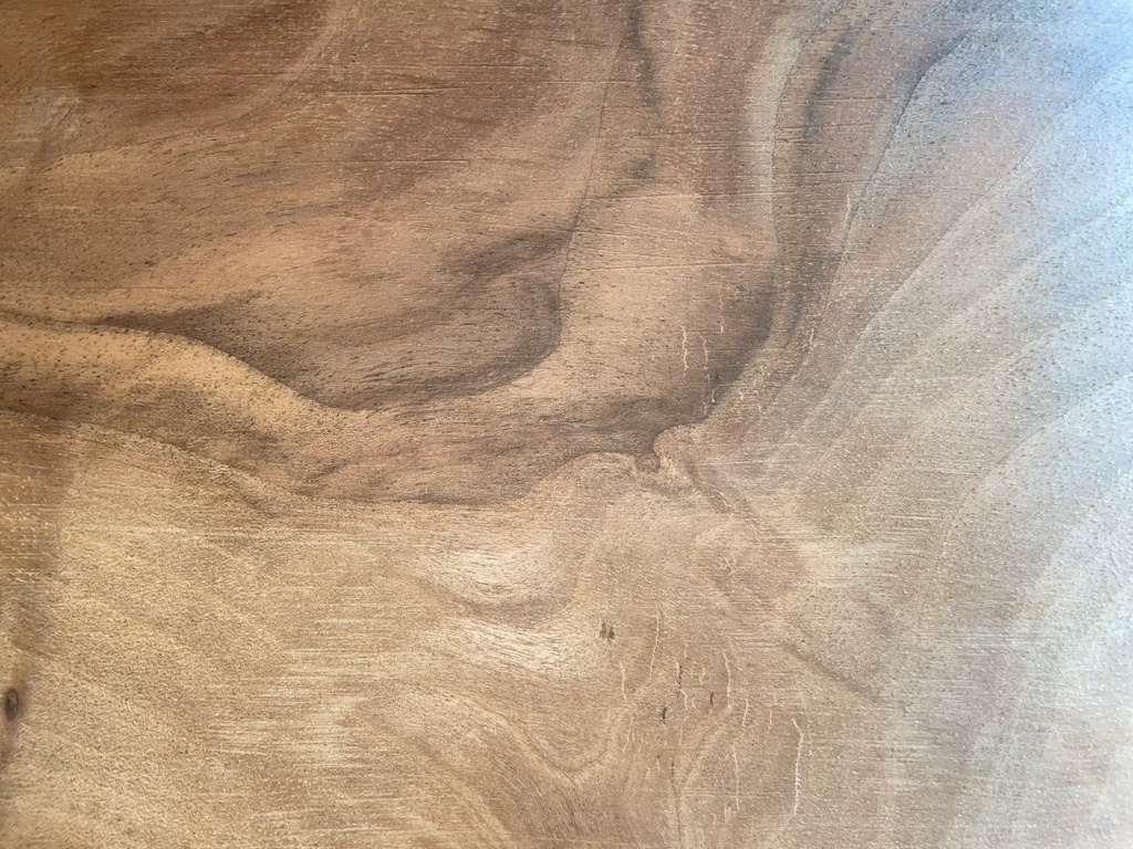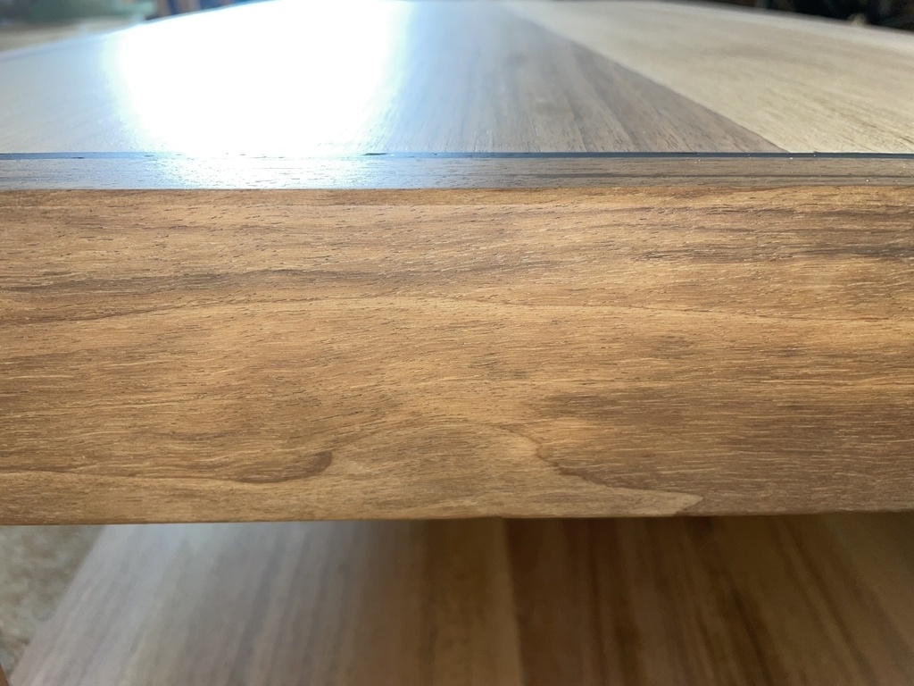 Les deux plateaux sont en merisier noyer massif et proviennent d'une unique pièce de 2m40 qui constituait le plateau supérieur d'un vieux meuble délaissé. Je n'ai pas réalisé l'assemblage du plateau en tant que tel, je l'ai seulement découpé aux dimensions qui m'intéressaient et l'ai remis à neuf.