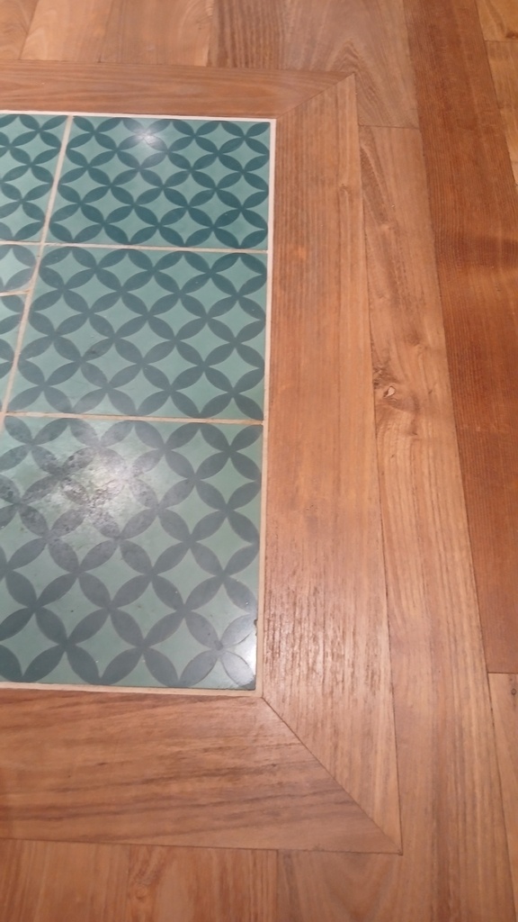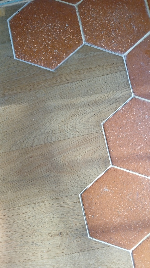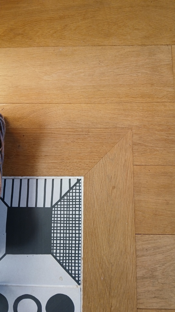 Concernant la méthode pour les hexagones, tu poses ton parquet en débordant un peu de sa zone, puis tu le découpe pour insérer le carrelage ?