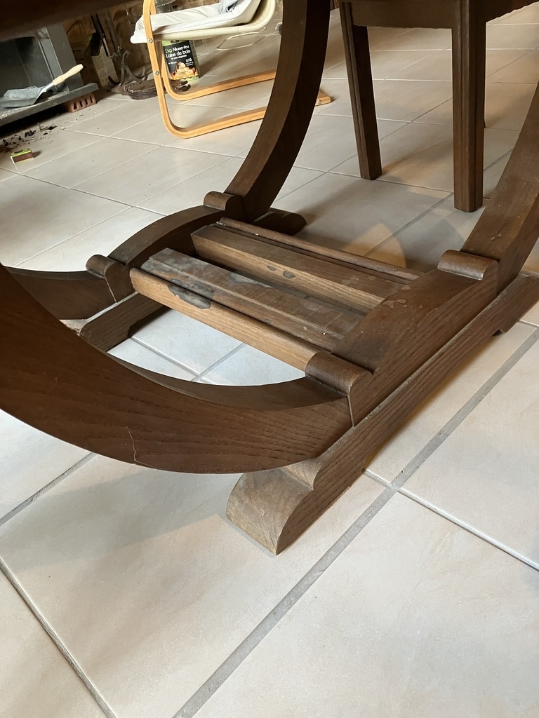 Ce plateau de dessus est relié aux pieds par tenon-mortaises et tourillons avec un minuscule point de colle : un coup de maillet bien placé et ce serait "démontable" aussi... Les tenons-mortaises des pieds dans ce plateau évitent aussi que le piètement en berceau ne "s'écarte" avec le temps (ou soumis au poids des strip-teaseuses / strip-teasers qui danseraient dessus).