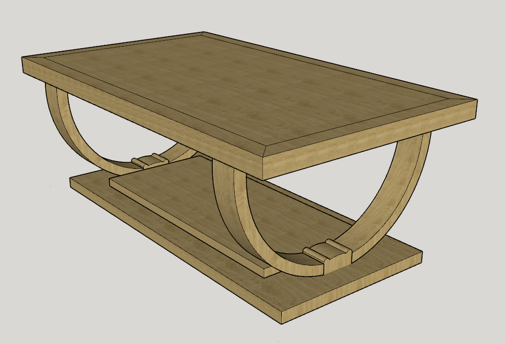 Les pieds seront en berceau (demi-cercle) et décorés d'un élément central sculpté à trois arrondis. Le tout adapté aux dimensions d'une table basse. J'ai voulu donner l'impression que le pied plongeait légèrement dans la base de la table.