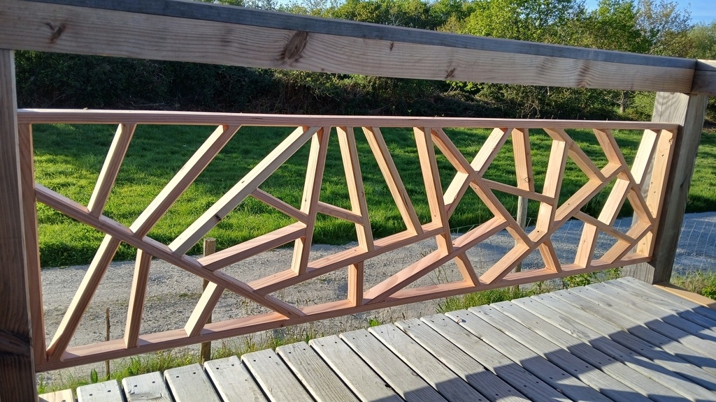 Un garde corps fait preque qu'avec des chutes. Largement inspiré du garde corps d'escalier publié par TissS. Pas plans, juste des coupes a la scie radiale et des vis inox.