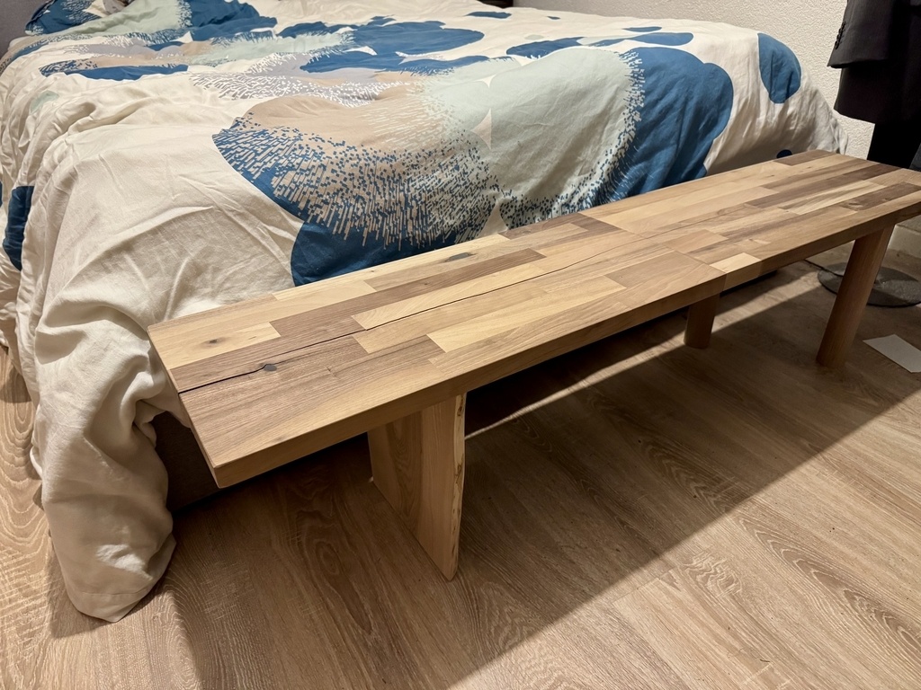 Pour le pied principal, j’ai utilisé une planche de frêne et un tasseau de chêne pour répartir le poids si on s’assoit au milieu.