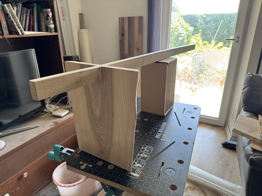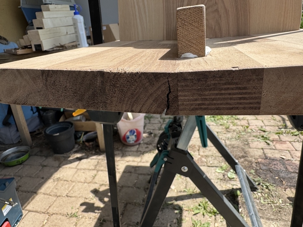 J’ai probablement merdé la découpe de la planche en frêne et la rainure dans la planche principale, car au moment du collage, une énorme fissure est apparue. => Système D, j’ai rempli la fissure avec de la colle. Ca support mon poids (sans aller jusqu’à danser sur le banc).