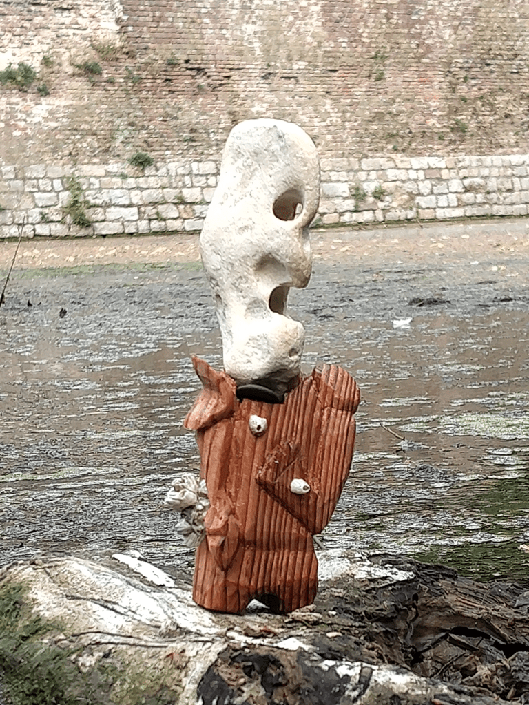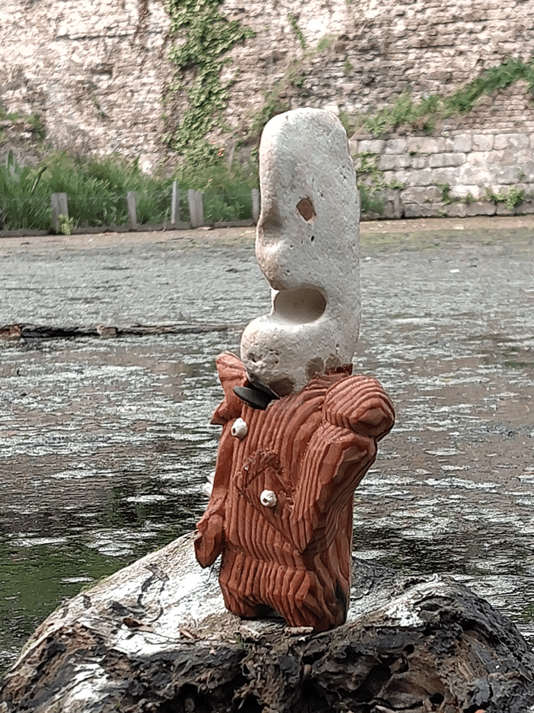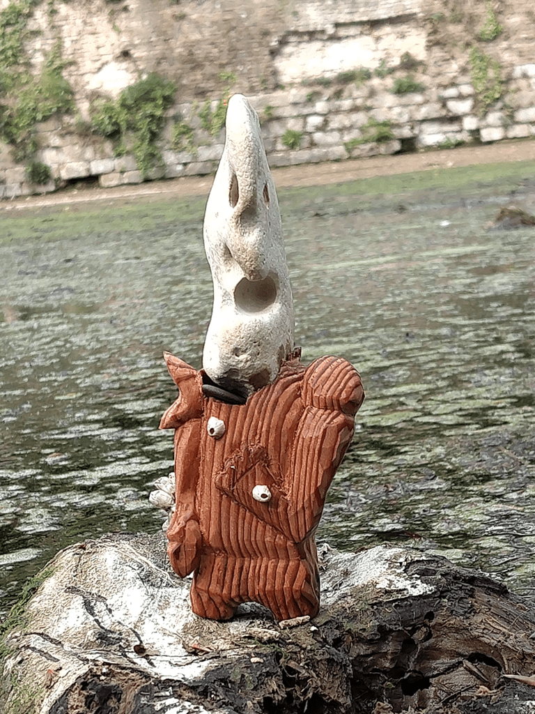 Sculpté à partir de pin abandonné dans la rue, pierres et patelles trouvées sur les plages de l'océan Atlantique.