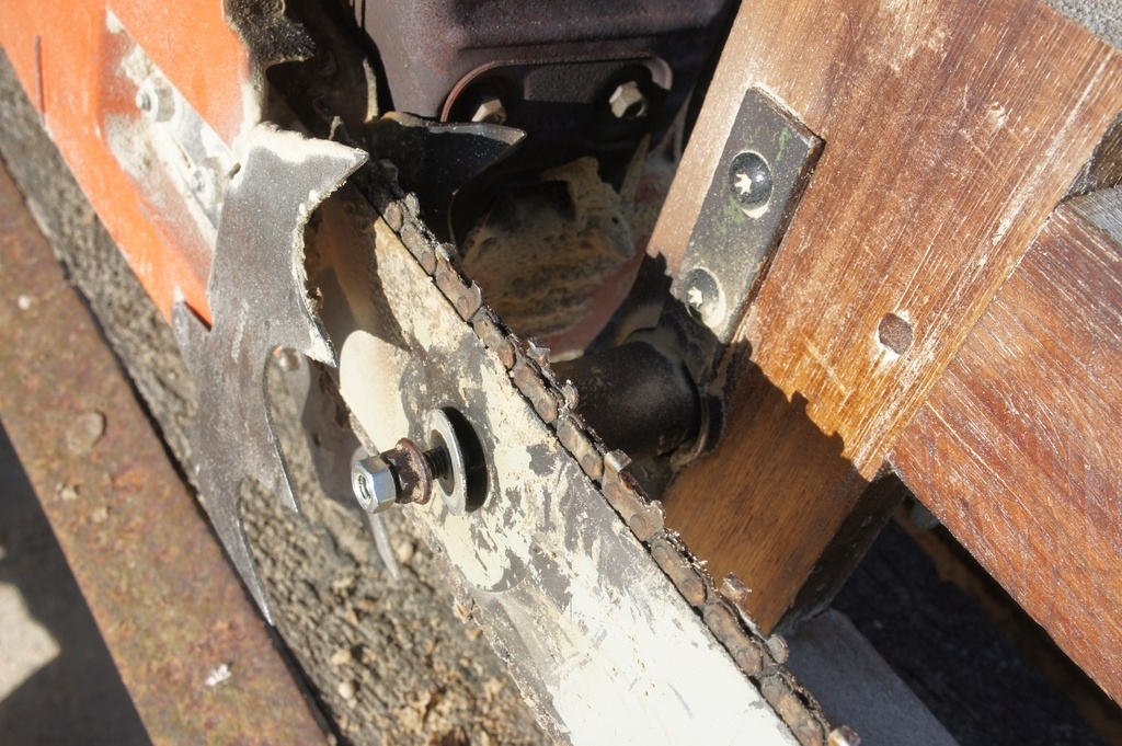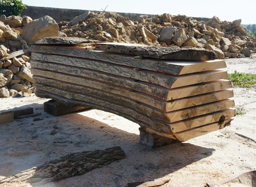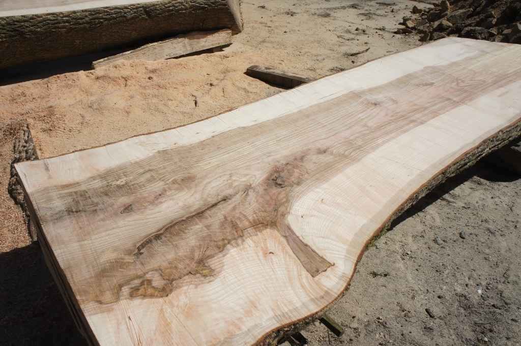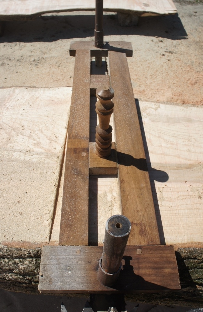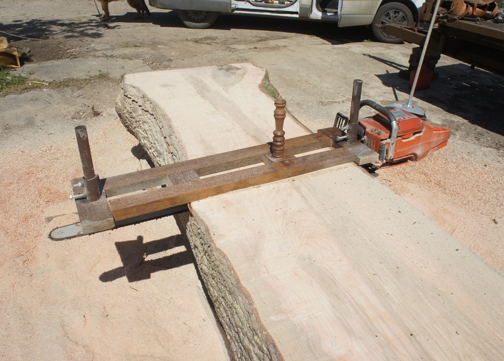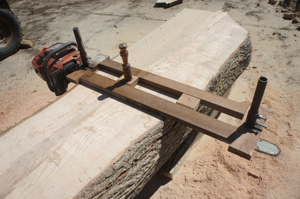 Bonjour, une gruminette avec le guide en bois. C'est de l'iroko assemblé par tenon mortaise. Cela marche bien, et c'est moins lourd que celle que j'avais fait tout acier. Il faudrait donner de l'inclinaison à la poignée, là, c'est trop casse poignet, justement. Ce frêne de haie était du vrai chien, les plateaux font pas loin des 100 kg pièce, en 65mm !