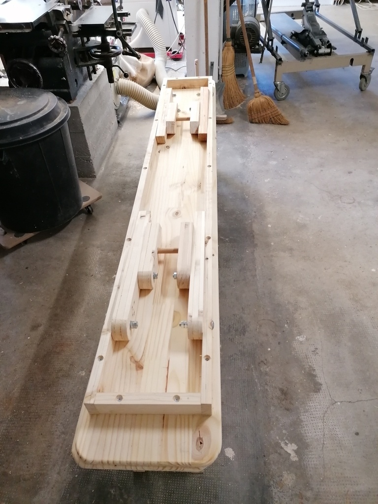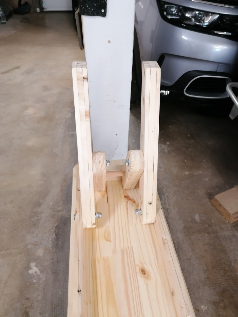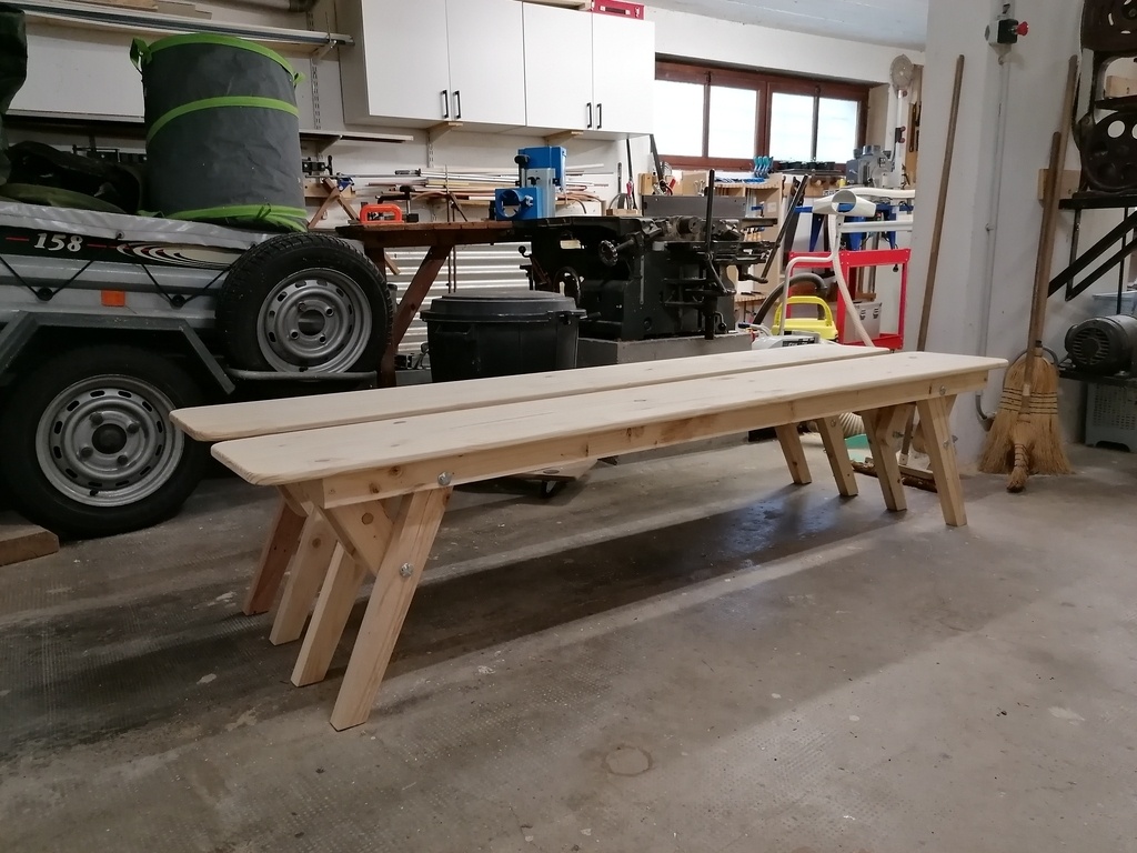 Réalisation en bois de palette (pieds et pièces de calage), et en sapin provenant d'un arbre abattu et scié par mon père il y a 20 ans environ. Les plateaux sont en lamellé collé abouté acheté en GSB, vu le faible prix et l'usage de ces bancs.