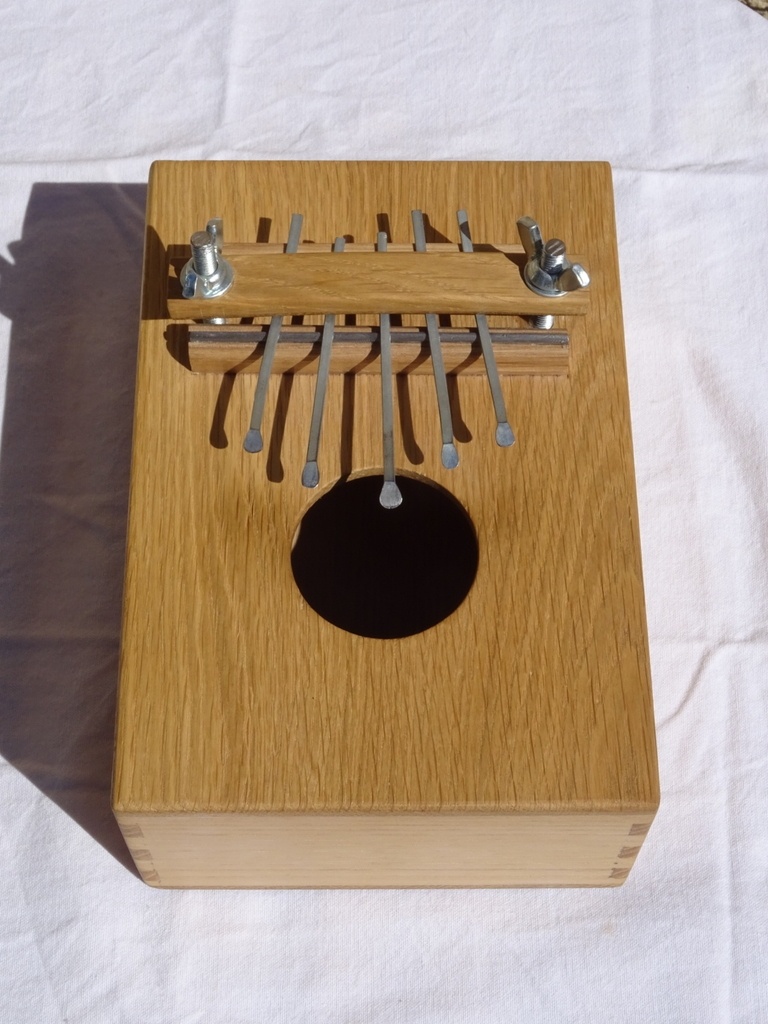 Je pensais fabriquer les lamelles à partir d'une vielle lame de scie à ruban mais j'ai retrouvé dans mon garage un kalimba jouet (qui sonnait atrocement mal), j'ai donc démonté les lamelles pour les réutiliser.