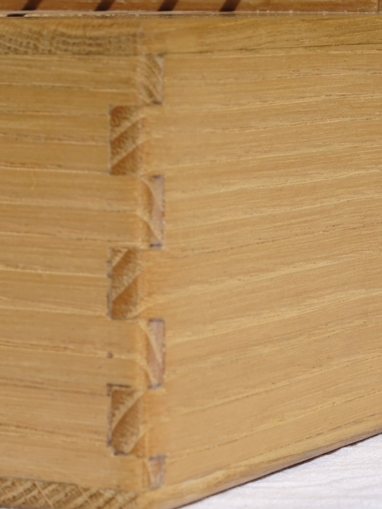 Pour le caisson, les panneaux du dessous et dessus sont en chêne et les cotés en châtaigner. Le tout en 5mm d'épaisseur assemblé en queues droites.