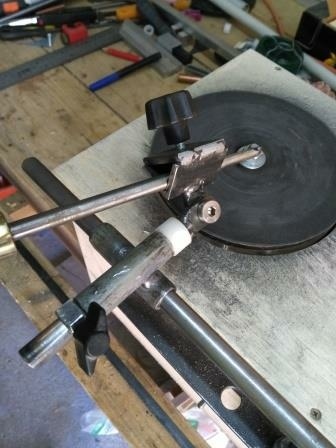 Le plateau est fixé par trois vis afin de permettre le réglage de la planéité. Je colle sur les disques du papier de verre grain 220 / 400 / 800 / 1000 / 2000 et 3000 soit 3 disques (deux papier par face) avec de la colle bâton pour enfant afin de pouvoir nettoyer facilement.
