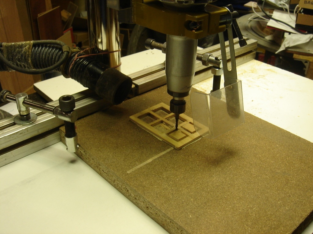 J'ai retrouvé des photos, sur ce principe, mais avec une bague de copiage pour indexer et une perceuse pour respecter la vitesse maxi du foret forstner