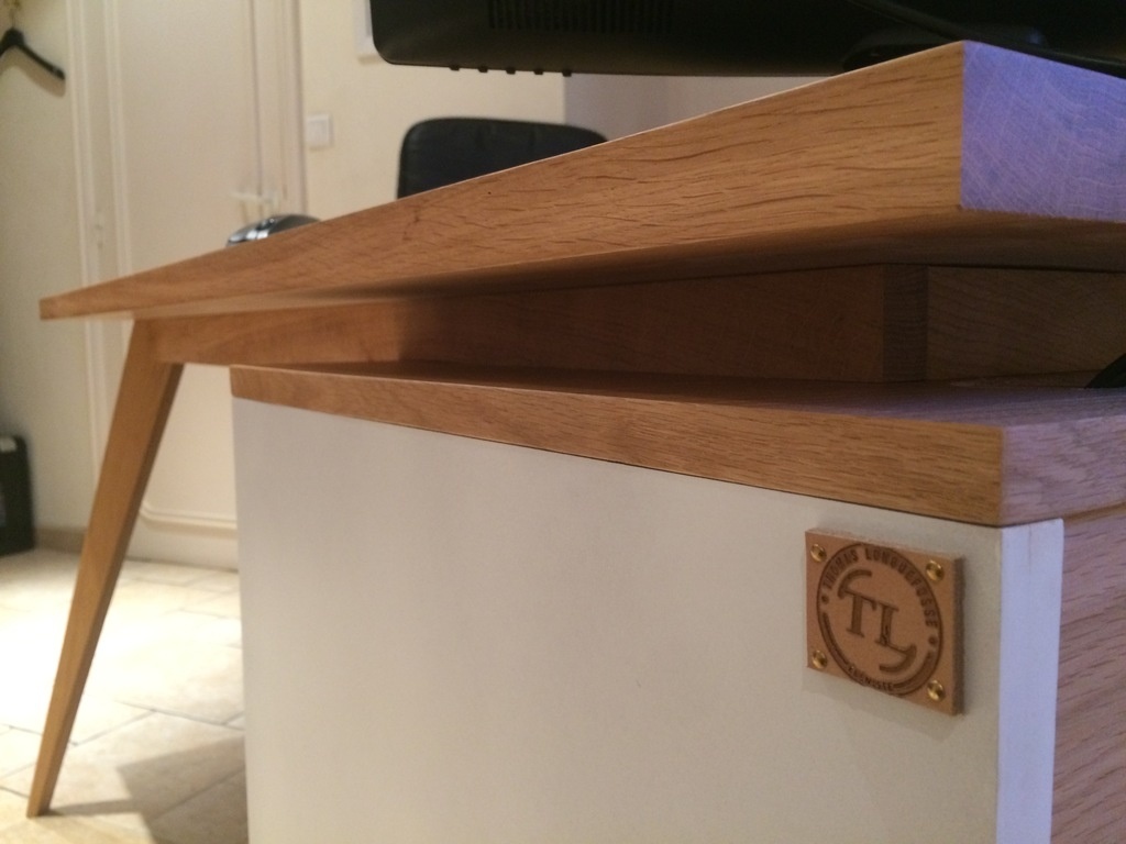 Le bureau se compose de deux modules. Un en CP chêne et médium laqué en blanc avec 3 tiroirs en massif et façades rapportées en médium blanc, et le second avec un plateau en chêne ( provenance pays basque) massif et des pieds un peu biscornus eux aussi en chêne.