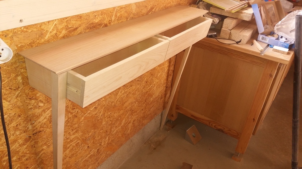 voici une console réalisée pour ma chérie. Cela faisait longtemps que le plan étais fait mais je n'arrivais pas à trouver le temps de m'y mettre. c'est chose faite!! L'insipration viens d'une console vue sur pinterest, j'y ai ajouté deux tiroir et adapté les dimensions aux besoins de ma moitié. Elle est entièrement réalisée en frêne, avec des dimension de L 1000 X l 180 X P 100 et une hauteur totale de 950mm. J'ai pris énormément de plaisir à faire ce meuble il y avait plein de petits défits à relever et pour arriver au mieux à l'objectif j'ai commencé par faire une fiche d'analyse de fabrication et d'usinage et je dois bien dire que si c'est un peu pénible à faire c'est au final très très utile pour arriver à l'atelier dans les meilleures conditions. Tous les assemblages sont réalisés avec des tourillons, à la tourilloneuse. Les pieds sont un assemblage de deux morceaux coupé à 45° sur la longueur et sont gainés à la raboteuse à l'aide d'un gabarit fabriqué pour l'occasion. voilà voilà si vous avez des question n'hesitez pas j'essaierais d'y répondre. A+