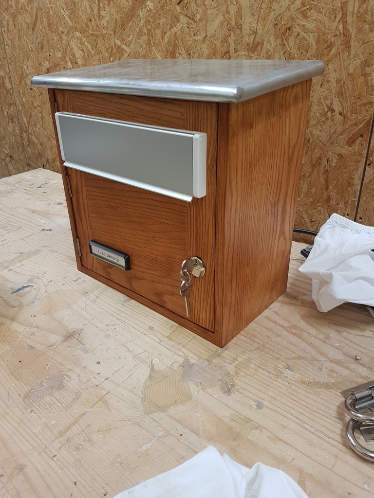 Petit boite au lettre en frêne avec porte sur charnières, petit toit en zingue.