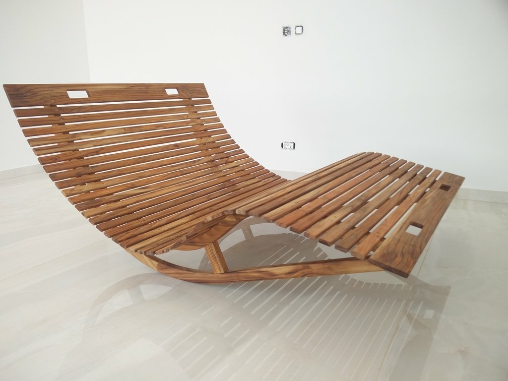 Bain de soleil en sipo. Les deux supports sont fait de 8 parties découpées au gabarit à la toupie, assemblées par doubles dominos. Les lames sont vissées. Le tout est huilé. Après un long essais je peux vous dire que c'est très confortable et il suffit de bouger les bras ou les jambes pour se balancer.