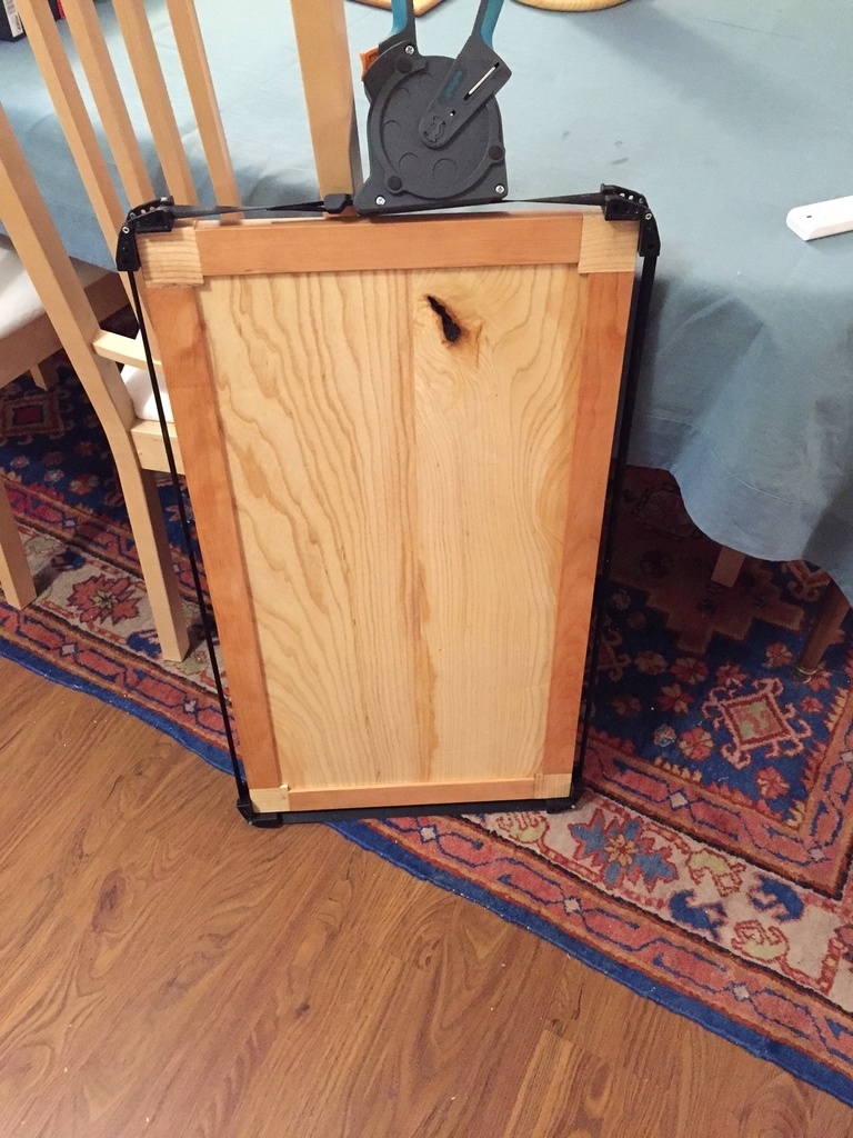 Malheureusement ce n'était pas le cas pour le reste, il y avait un écart de 5 mm dans les diagonales!! A mon avis cela est dû à ma méthode de collage (grands côtés séparemment des petits). j'aurai sûrement dû tout assembler en même temps et corriger l'équerrage avant le séchage...