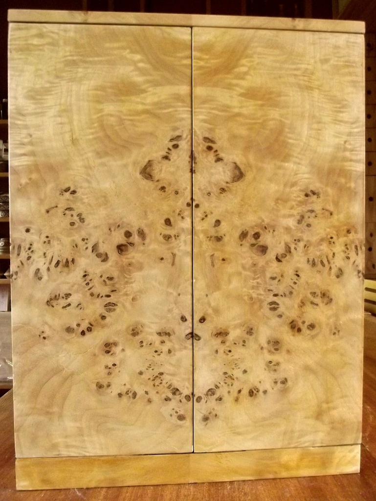 Il est plaqué extérieurement de deux feuilles de loupe de peuplier opposées.
