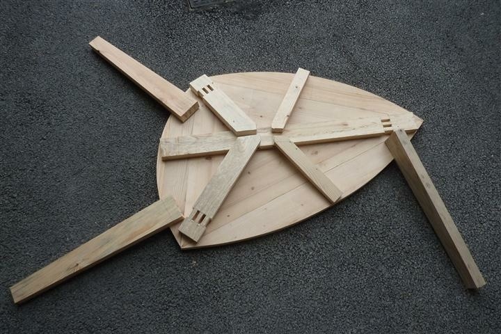 14- tourillonage pietement sur plateau : tous les tourillons diam 10 chêne collés avec coins preparés et bout dans trous borgnes (queue de renard ) et en biais (queues d'aronde car en traction )arasées + coin au final