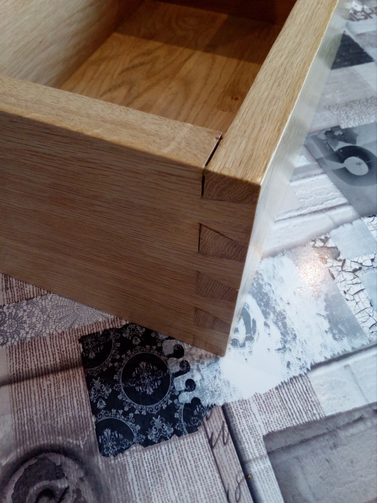 Du coups, j'ai profité de cette occasion pour faire mon premier projet d'ébéniste, au sens où je suis parti, pour la première d'un pièce de chêne brute de scierie (sauf le fond qui vient d'un panneau de chêne lamellé/collé acheté en GSB), que j'ai déligné et passé à la rabot/dégau puis réalisé mes toutes premières queue d'aronde et à la main.