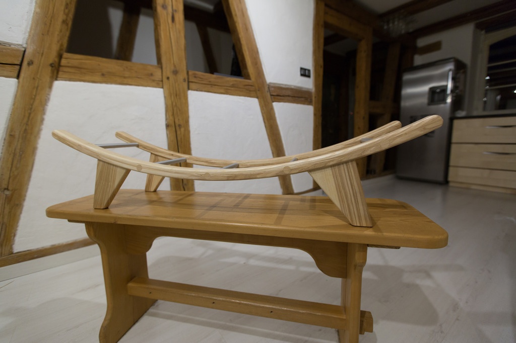 Réalisation d'un porte bûches en lamellé collé. Les pieds et les deux longerons courbes sont en frêne, lamellé collé, les traverses sont assemblées à l'aide de tiges filetées boulonnées traversantes et glissées à l'intérieur d'un tube d'aluminium anodisé. Touts les trous sont rebouchés avec des bouchons en bois de frêne.