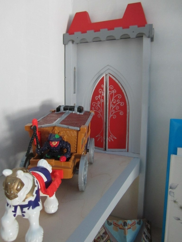 Une fois le plan exécuté la réalisation ne pose pas de problème particulier et la peinture était amusante à faire. Quelques petits détails tout de même, comme les tourettes ou la porte cochère qui s'ouvre vraiment (mais sur le mur...). L'horloge marche vraiment et est placée pour être visible depuis le salon et l'entrée. Les escaliers sont tous amovibles et les enfants ne se sont pas privés pour les utiliser dans d'autres jeux. Enfin l'échelle de la forteresse est la même que celle des bonhommes playmobil.