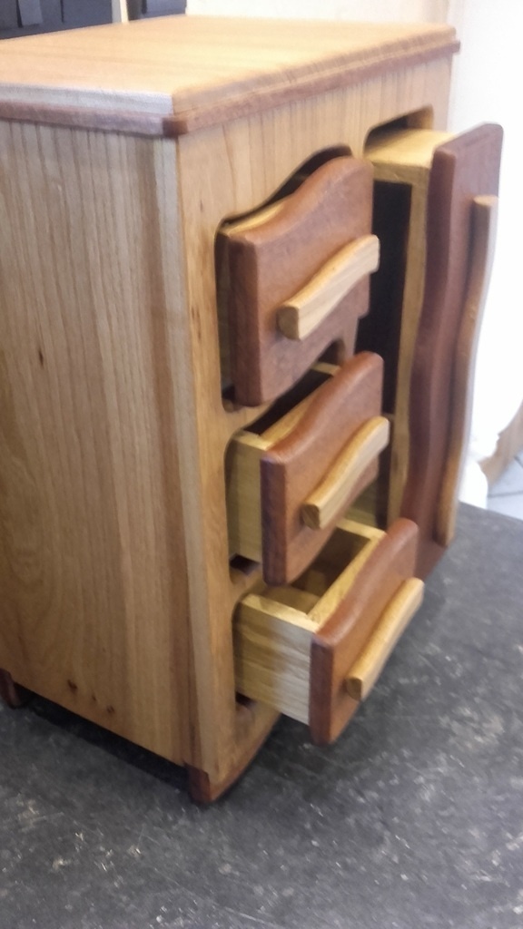 )et en bois exotique dons j'ignore la provenance et l'essence .Les caissons de tiroir sont en chêne avec séparation amovible .Pour les formes j'ai utilisé des bagues de copiage ,différentes bagues, différente fraises, un tonne de gabarits mâle et femelle le tout fait surtout au pif avec beaucoup d'essais jusqu'a trouver ce qui me plaisais .