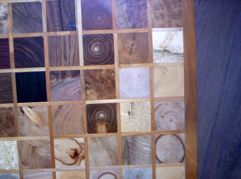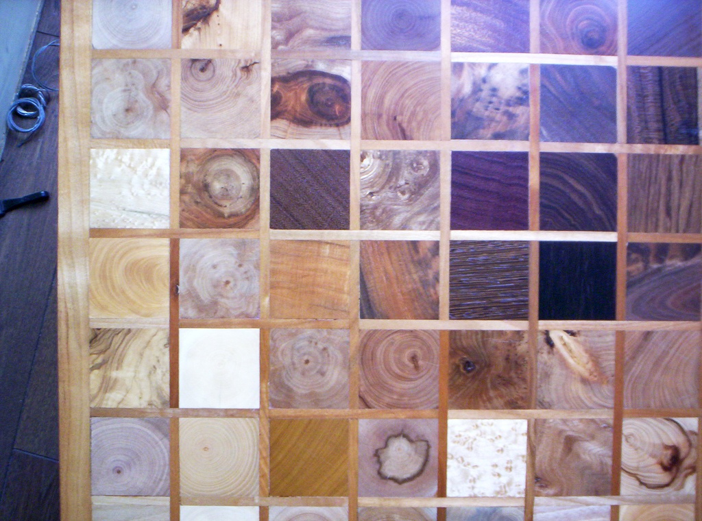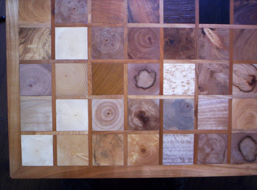 Dans ce quadrillage est inséré une résille de baguettes en cerisier de 15 mm de hauteur, elles dépassent de 10 mm du plateau en contreplaqué. Dans les carrés formés par la résille on enfonce et colle des carrés de bois (en bois de fil et bois debout) de 10 mm d'épaisseur, environ 5*5 cm, de différentes essences pour composer un motif.