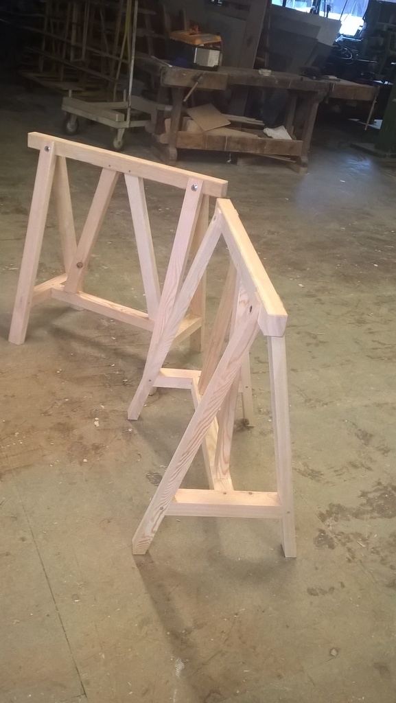 Les tréteaux sont en pin assemblée en tenon et mortaise chevillé a la tir avec des chevilles en chêne coniques que j'ai aussi fabriquer a l'aide d'un gabarie a la scie a format.