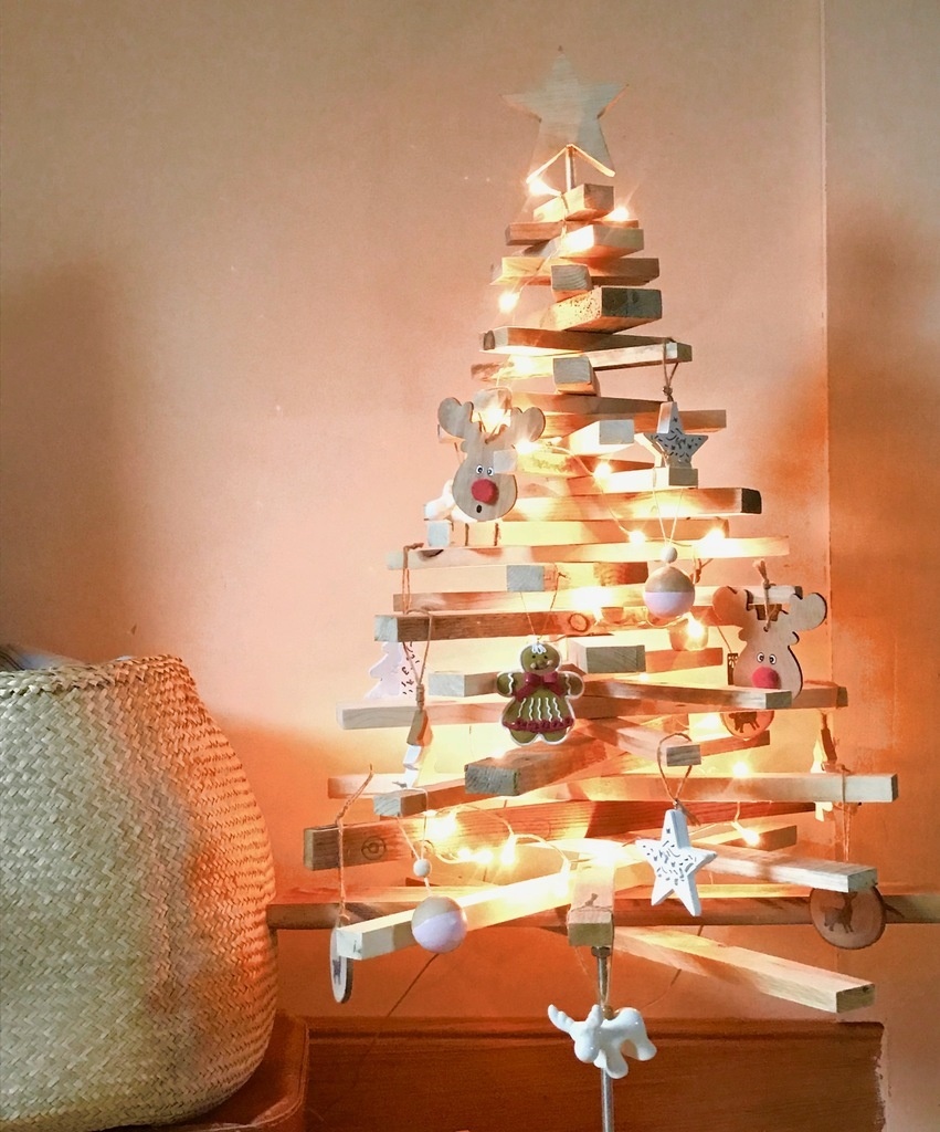 Première contribution au site pour présenter mon modeste sapin de noël fait de bois de palettes et de chutes autours d'une tige filetée.