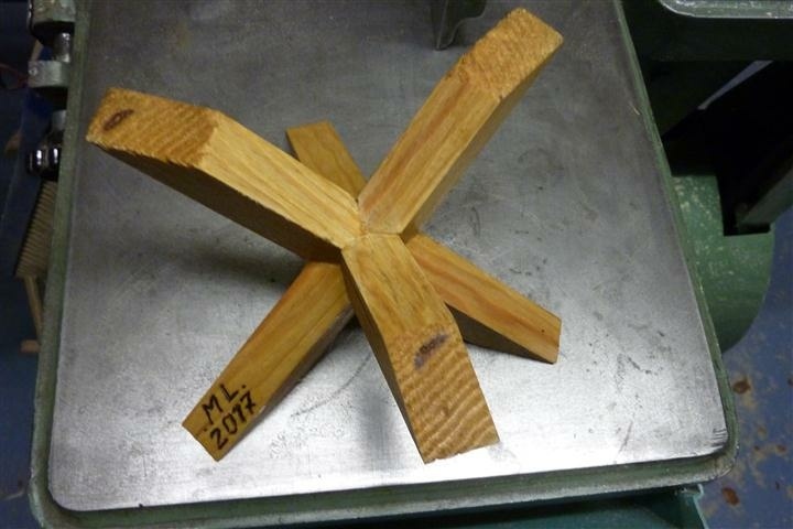 Experimental ...solidité mediocre car collage en bois debout ... le "grand ecart " des pieds assuré ( tous les arbaletriers ont en pied un entrait ou à mi hauteur un entrait retroussé ) realisé en sapin section 30x42,5mm. htr35 cm. env .... la pente des pieds impose la section des bois renforts des croisements impossible (en horizontal et vertical )...... dessin indispensable ....ce trepied : 18 coupes à la scie au total...