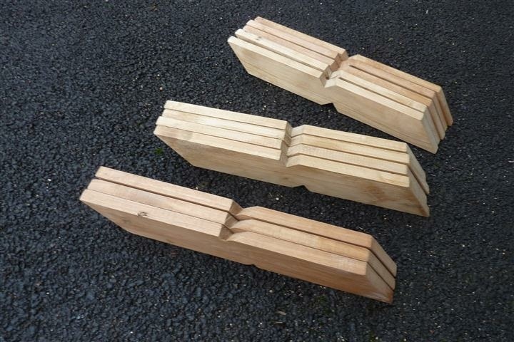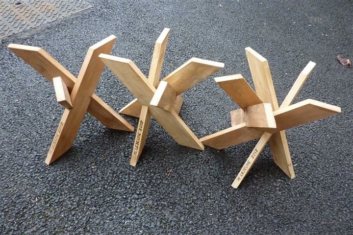 double entaille à face horizontale pour chaque assemblage... donc pas de glissement possible et de vrillage comme mes treteaux buenos-aire ....... voir sur google "charpentes reciproques " en images .. mes maquettes de ce jour ont une forte pente qui oblige une largeur importante des bois (la section restante entre les entailles face à face assure la solidité du pietement )...mes assemblages sont simplement collés ...petite epure et calculs trigo pour precisions entailles ... chosir sa surface horizontale de contact (les surfaces face à face ne correspondent pas sur le 3 et 5 pied : visible sur photo ... valable pour tabouret ,gueridon et bout de fauteuil ....pente maxi limitée comme mes treteaux buenos aire (qui existe aussi sur google images ....