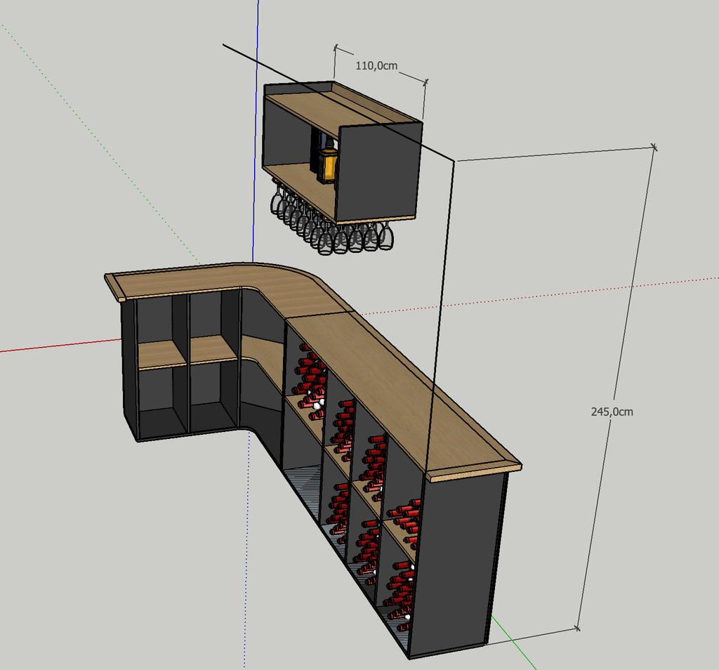 On m'a demandé de dessiner un bar pour des particuliers avec plein de rangements en mélangeant bois et un autres matériaux. J'ai donc utilisé du valchromat noir, du bois, du cp Chêne et quelques boulons pour rajouter de la couleur un peu métallisée.