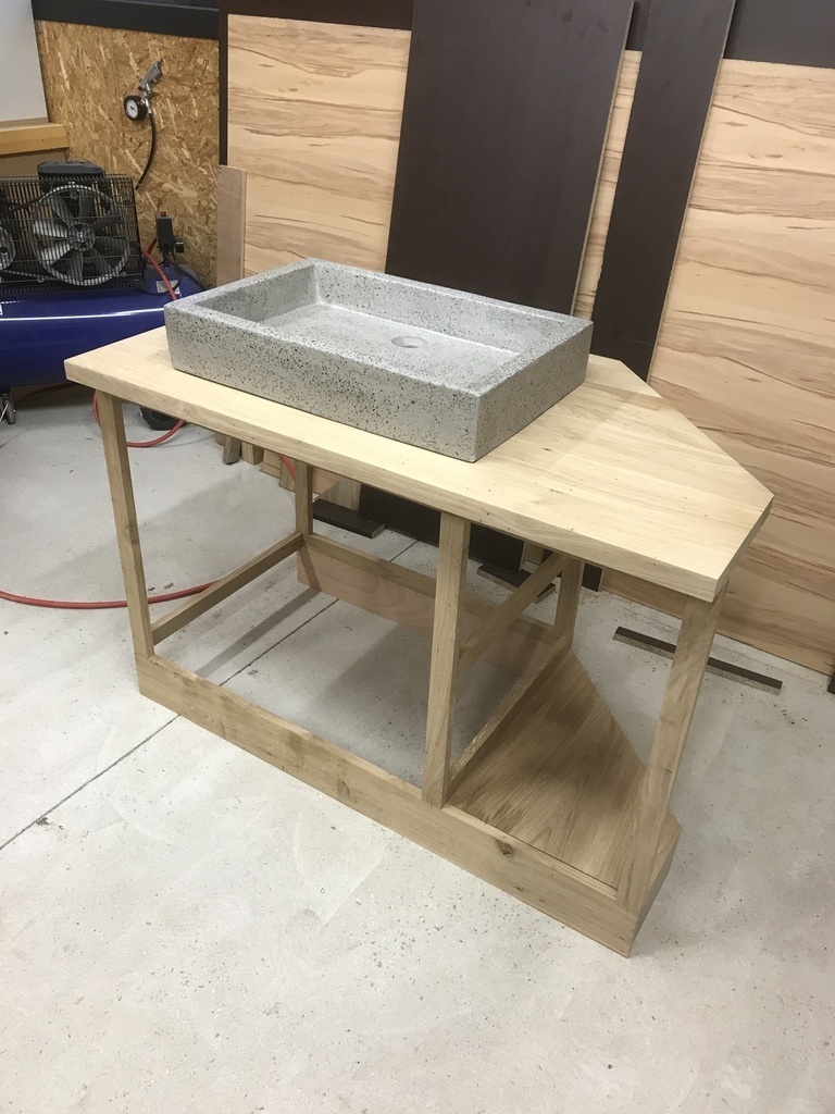 voici la réalisation de mon meuble pour notre salle de bain de notre chambre parentale. J'ai fabriqué ce meuble sur mesure pour prendre place dans un angle. la structure, le plan de travail, les tablettes, les facades de tiroirs et le panneau vertical mural sont en massif. Les caisses de tiroirs et le module de cases à gauche du miroir sont en mélaminé.