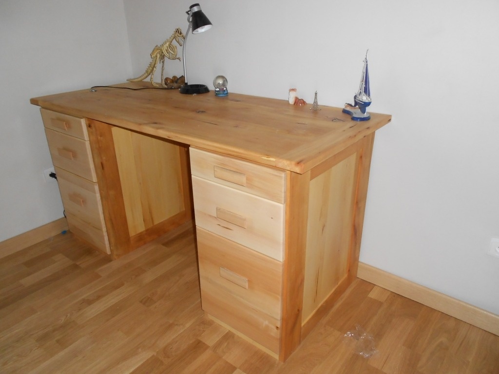 Ce bureau a été réaliser pour la rentrée du fiston en 6ème. Il a demandé un système pour faciliter le rangement. Il m'est venu l'idée de ranger les bouquins debout. Après un petit essais très convainquant, on passe à la fabrication. Assemblage de la structure par dominos et vissage du plateau en laissant une marge dans les trous des colonnes. Emboîtures sur les côtés du plateau. Le tilleul est très sec (séchage 20 ans). Poignées maison.