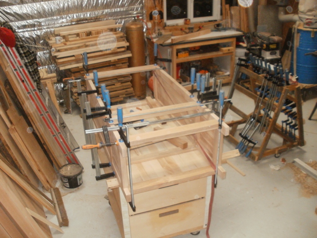 le moins simple, surtout la recherche du truc pour le tiroirs, finition à la cire travaux à la charge de mon chef de projetsssssssssss, résultat en kilo de pointes 2.74, volume de bois sais pas! temps, hum en Normandie de la pluie pourquoi?
