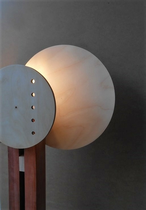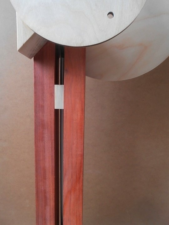 Le pied est réalisé à partir de lambourdes en padouk, la base en multiplis de hêtre, aux plis très fins, les écrans sont en contreplaqué de bouleau de 1,5 mm. Le plus petit écran est en fait un sandwich composite: deux couches de cp fin, et une âme réalisée à partir de carton plume.
