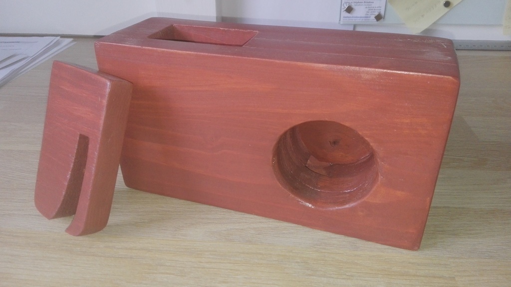 J'avais été séduit par le principe, tout simple: un cube, une boite en bois, avec un gros trou, une fente pour glisser le téléphone, et cela joue le rôle d'amplificateur... Pas d'électronique, pas de piles, un bout de bois, et on joue sur les lois de l'acoustique. Rien de plus simple.